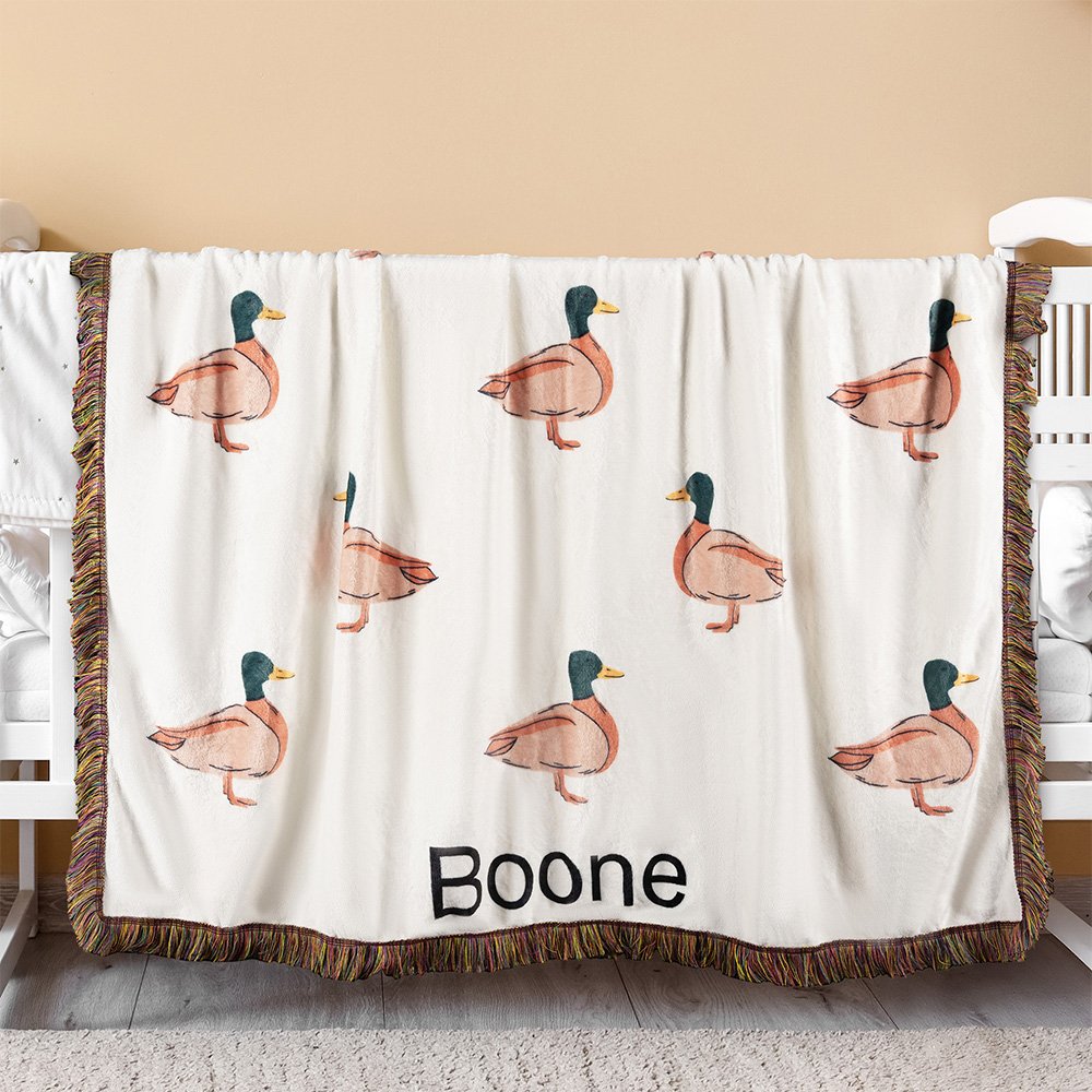 Bring the charm of outdoor adventure to your baby's nursery with this Personalised woven blanket featuring an adorable mallard duck pattern. Available in five sizes, the blanket can be customized with your baby's name to add a heartwarming touch to the decor. Colorful tassels on the sides add a handmade touch, making it a stylish addition to any nursery.