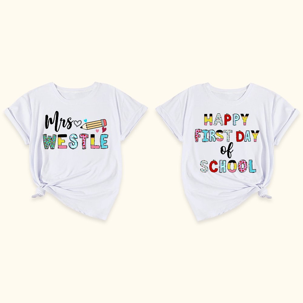 The lettering on this T-shirt stands out by combining classic educational elements such as apples, notebooks, crayons, and custom text. Printed on the back: "HAPPY FIRST DAY OF SCHOOL". The bright colors and images show the teachers' tireless efforts, energy, and passion for teaching.