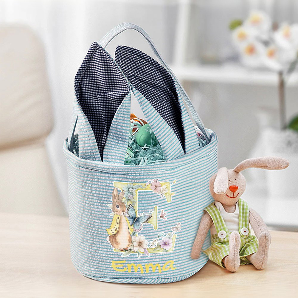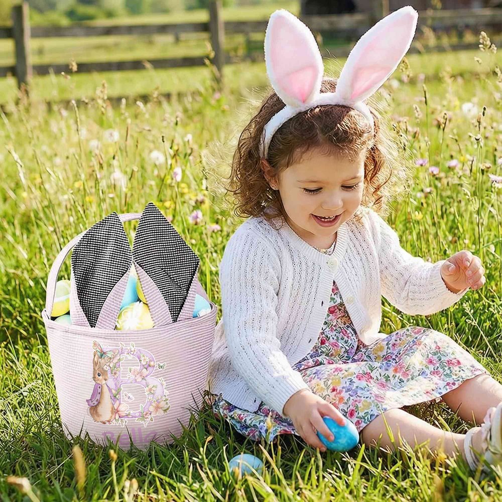 This Easter basket features the classic Peter Rabbit as its core element, complemented by flowers, butterflies, and an initial, giving it a festive feel. The basket boasts adorable bunny ears and a contrasting striped design, and is available in four colours: pink, green, blue, and purple. Each basket is customized with the initial and the kid's name, making it a unique symbol of the Easter holiday.