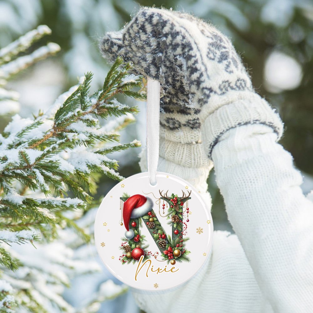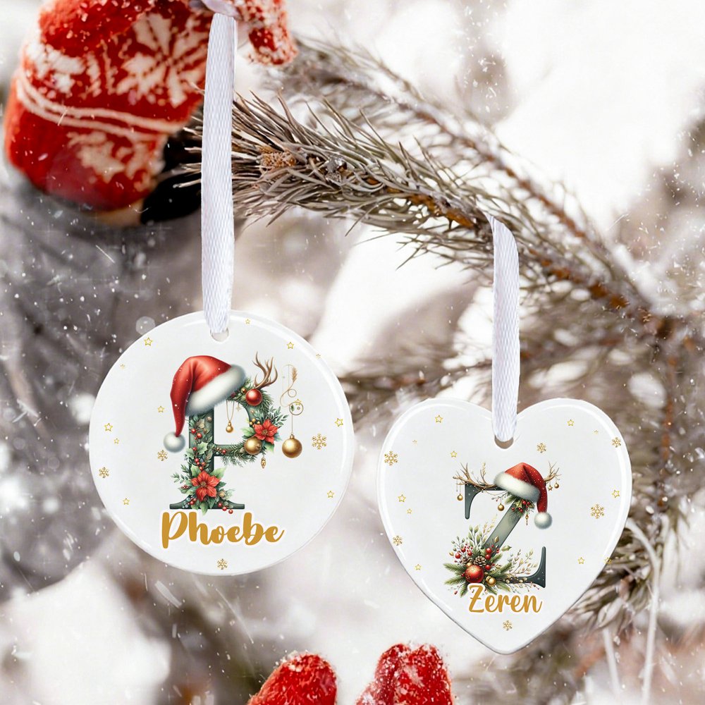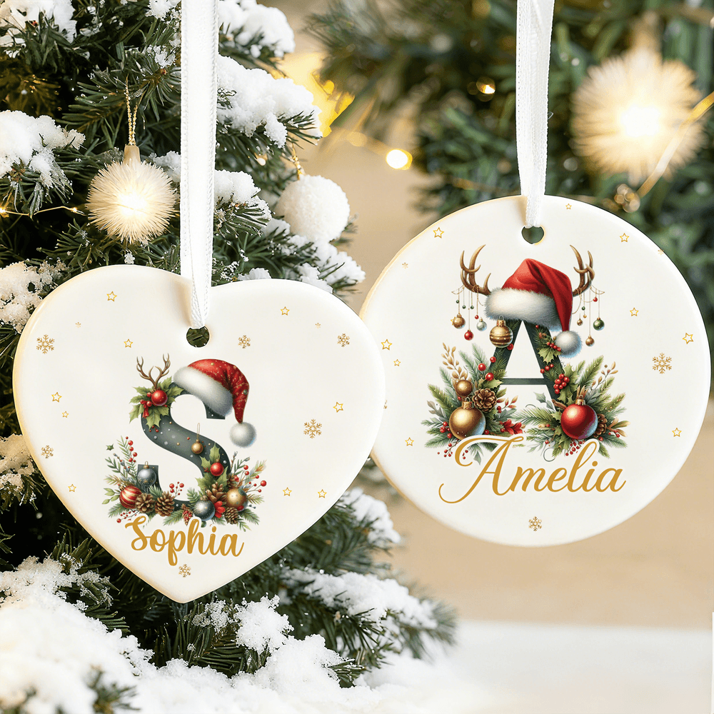 Personalized Cute Reindeer Santa Hat Initial Ceramic Christmas Ornament with Name Christmas Decor Gift for Family Friends