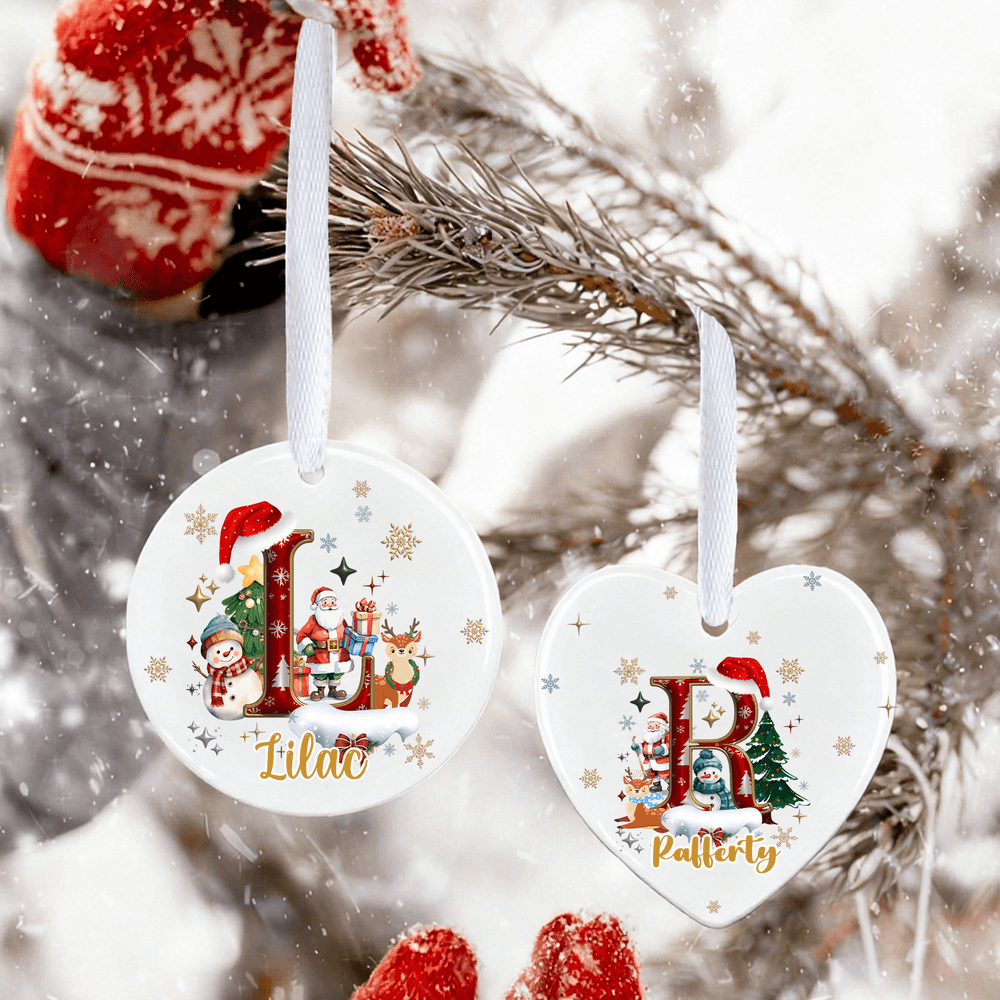 These ornaments feature cartoon-style Christmas letters, paired with festive elements like Santa Claus and snowmen, and can be customized with your name. They are available in heart and disc shapes, with vibrant glaze colours that create a warm, festive symbol exclusively for your family.