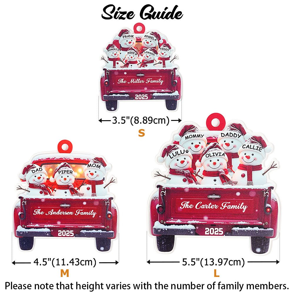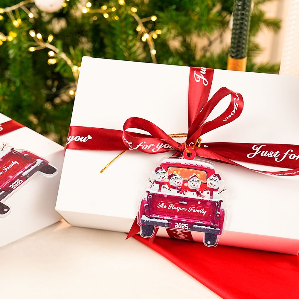 This ornament features cute snowmen and classic red Lorrys as the main elements, full of festive warmth and joy. Each snowman has a playful smile as if welcoming the arrival of Christmas, making your holiday decorations more vivid and interesting. You can customize the names, years, and family names of 3-6 family members to make it a unique Personalized souvenir.