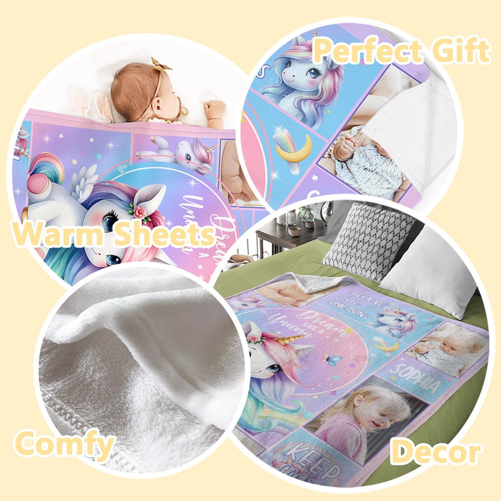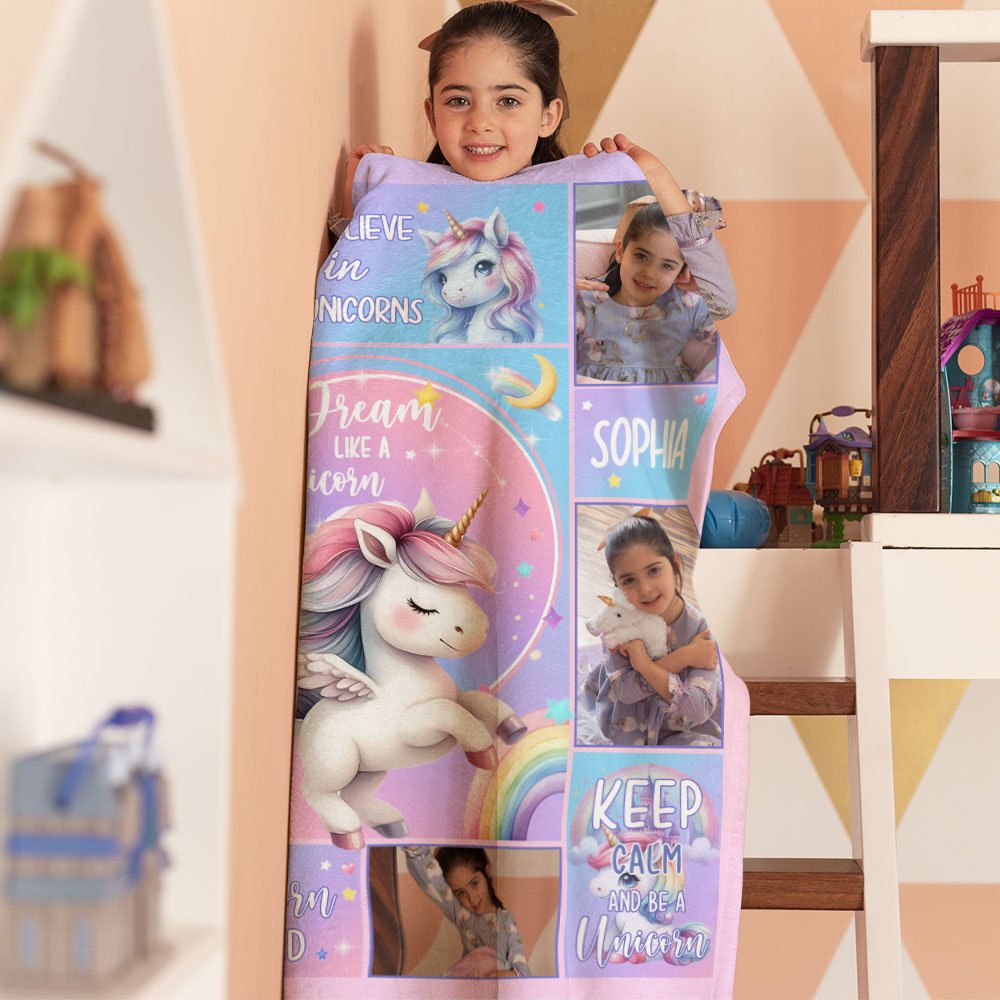 This blanket is inspired by the cute unicorn, whose elegant posture, shining horn tip and gorgeous mane bloom in soft colours, creating a dreamy private space for girls. Personalise it with your child's name to add a special touch and make it a unique gift.
