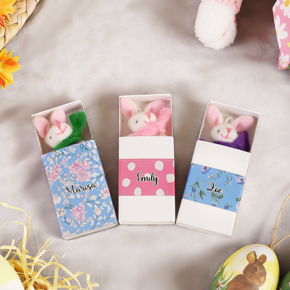 This adorable mini Easter bunny sits inside a vintage-style matchbox. The matchbox offers multiple pattern style options and supports name customization. The bunny is dressed in a felt scarf, featuring exquisite details that create a delicate and charming miniature artwork.