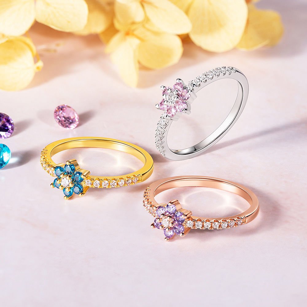This exquisite dainty flower birthstone ring allows you to add a personal touch by featuring your choice of birthstone. Select the birth month of your loved one to create a unique piece that symbolizes their special day, making it an unforgettable gift.
