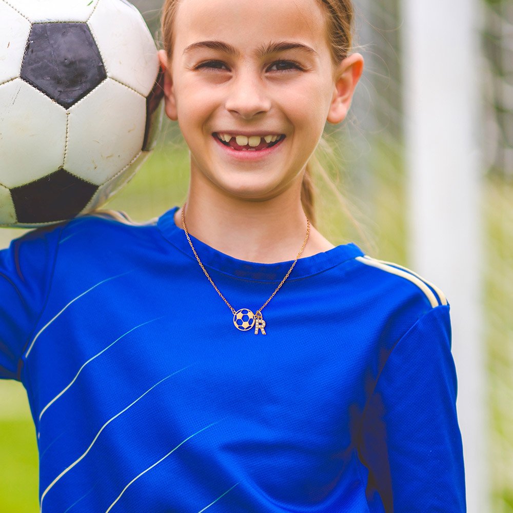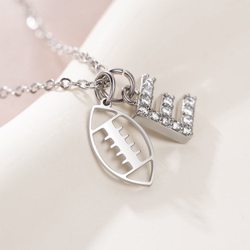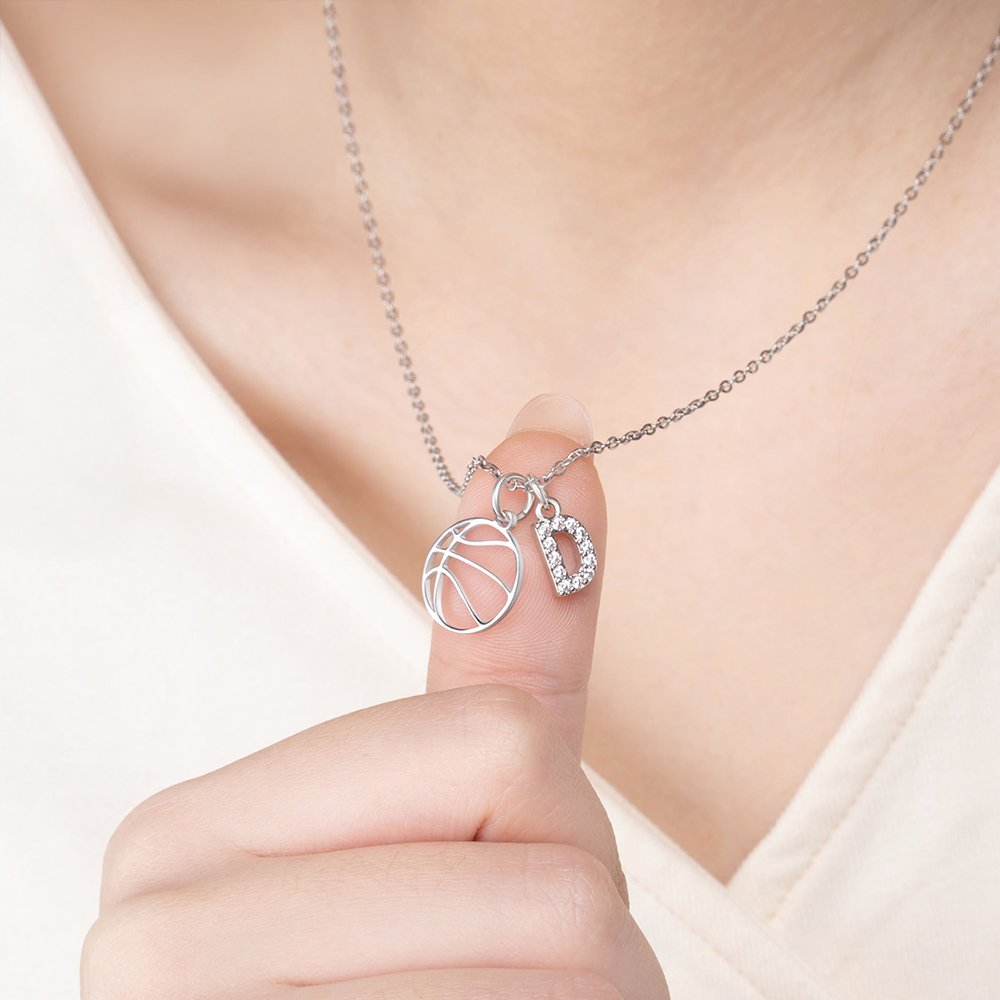The necklace showcases a dynamic sports-themed design that celebrates your passion for ball sports. You can choose from various pendants, including volleyball, soccer, football, basketball, baseball, or a cheer megaphone. This necklace is customized with initial pendants set with dazzling zirconia stones. This eye-catching feature not only enhances the overall beauty of the necklace but also reflects your favorite sport while adding a touch of personal style.