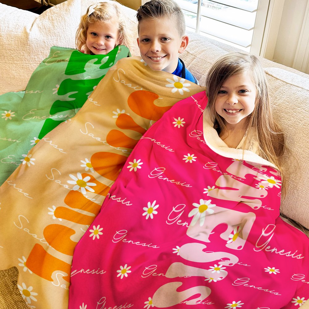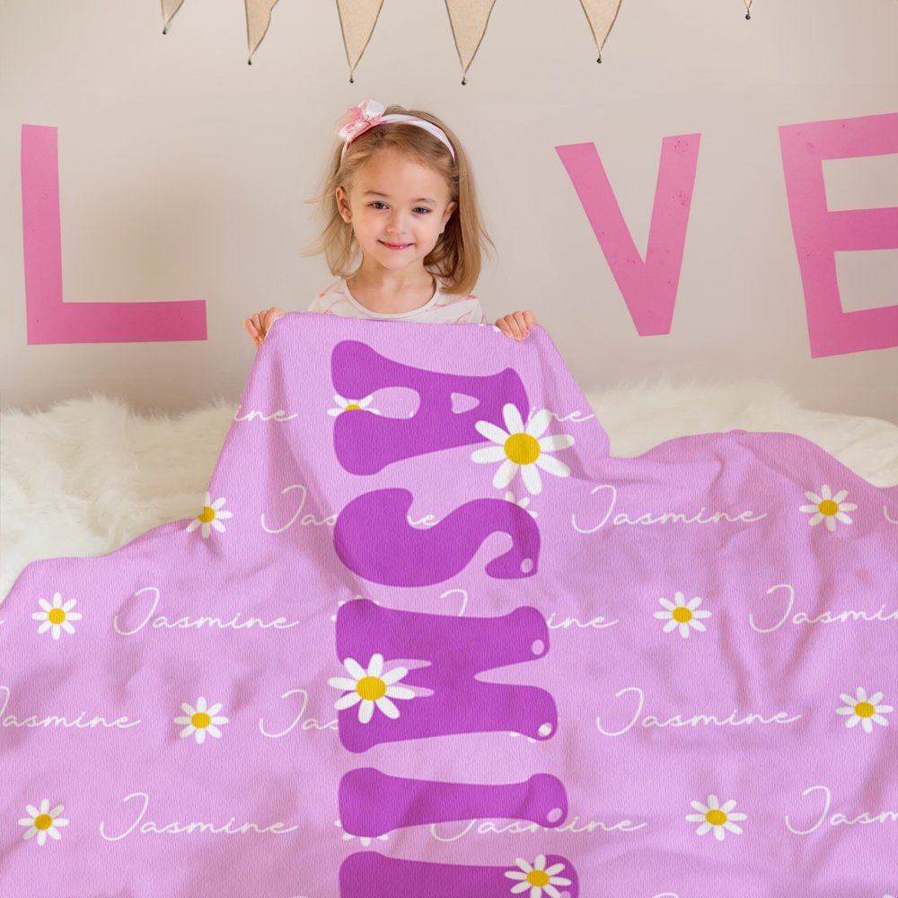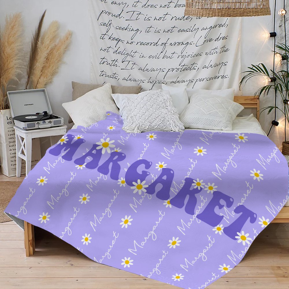 This blanket is available in various refreshing colours, symbolizing sweetness, romance, and happiness, with daisies and artistic bubble fonts, making the whole item more emotional and appealing. You can also add your name, displayed on the blanket, in a repeated and superimposed arrangement to create a unique home decoration.