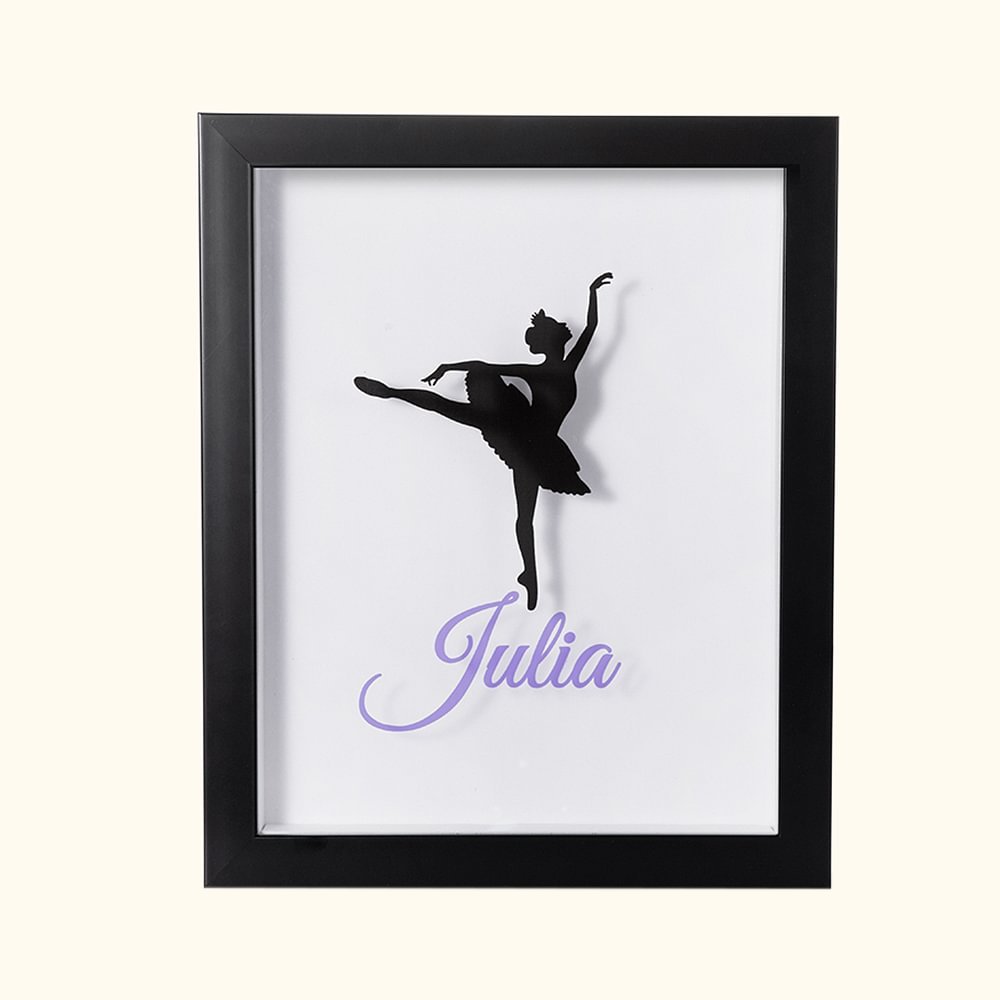 This wooden shadow box serves as a special keepsake for ballet dancers to collect and display their recital pins. It can be Personalized with a dance pose or your photo, along with the dancer's name. It's a unique and meaningful way to collect and showcase the dancer's achievements and growth.