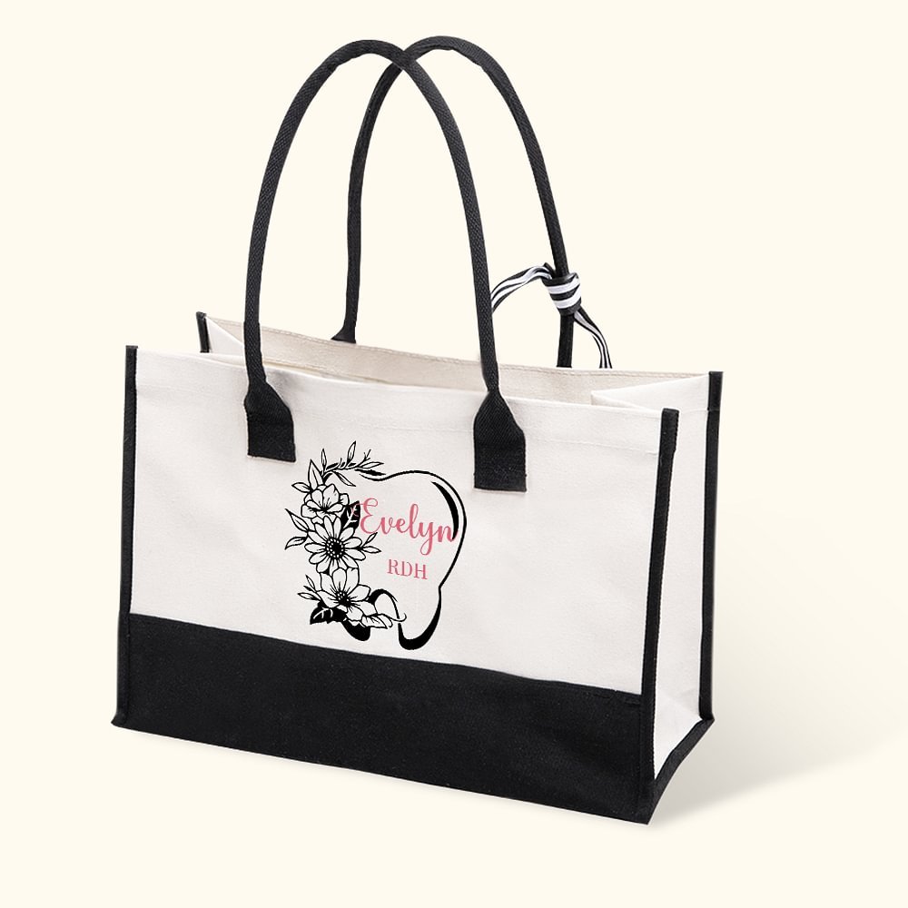 This large canvas tote bag features a vibrant, dental-themed print, making it a stylish and practical accessory for dental professionals, students, or anyone passionate about the field. Customizable with the recipient's name, this tote bag becomes a unique and Personalized item that reflects their identity and interests.
