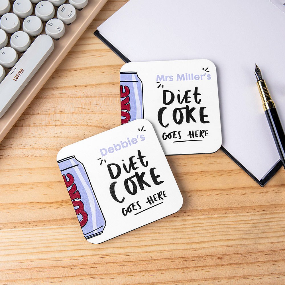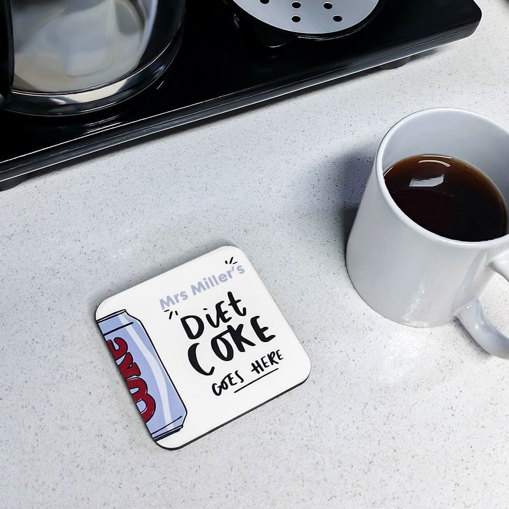Personalized Diet Coke Goes Here Water Absorbent Wooden Coaster with Name Funny Birthday Housewarming Gift for Coke Lovers