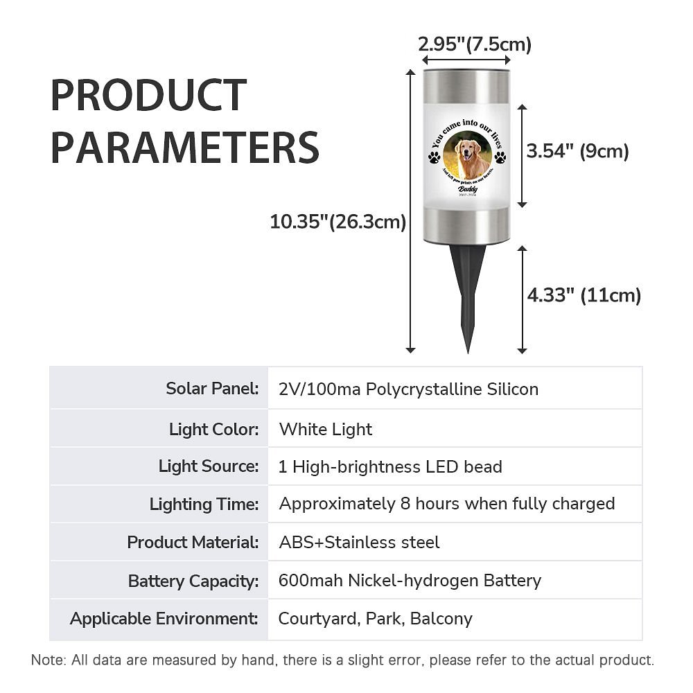This meaningful solar garden light is specially designed to honor your beloved pets. Featuring adorable paw prints and commemorative text, it embodies eternal warmth and your deep affection for your furry friends. You can easily upload your pet's photo, name, and lifespan, so that when night falls and the light illuminates, it feels as if your pet is right by your side, bringing you comfort and peace.