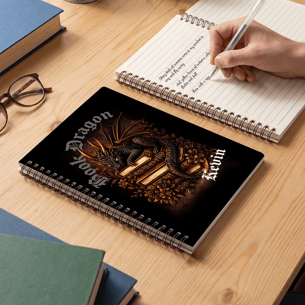 The notebook features a "book dragon curled up in a stack of books" theme, available in two base colours (black and white) and seven exquisite patterns that blend retro floral elements. Each notebook can be personalized with a name, offering six unique font styles to choose from. This transforms the book dragon into a magical companion for writing, capturing the imagination of readers within its pages.