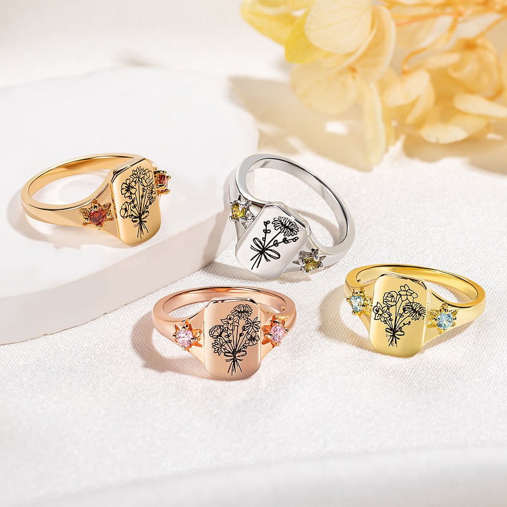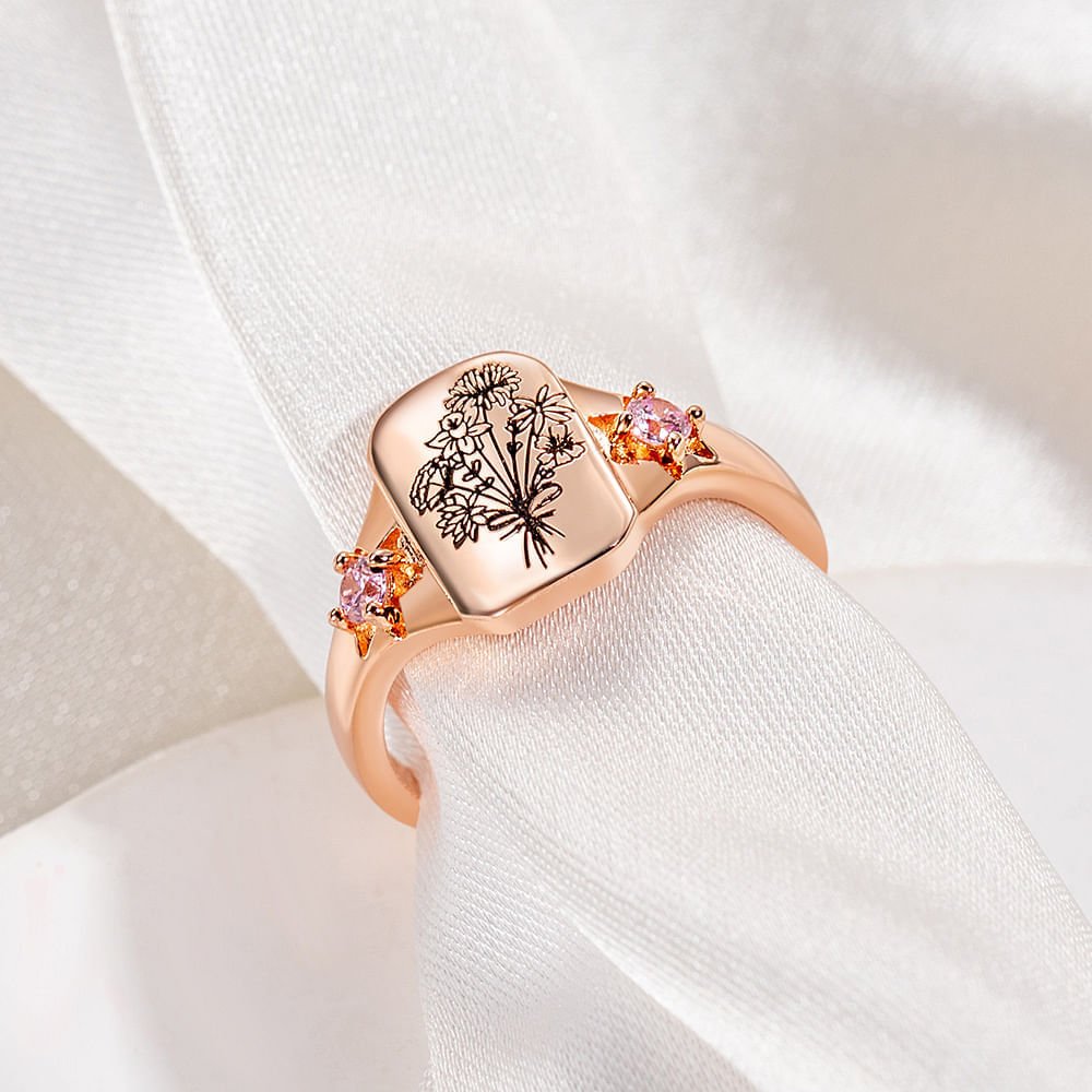 This ring with a bow-tied birthday bouquet design is lovely. There is a gem on each side of the ring. You can customize your birthstone and choose 1-6 birth flowers to create a unique, elegant, and beautiful ring.