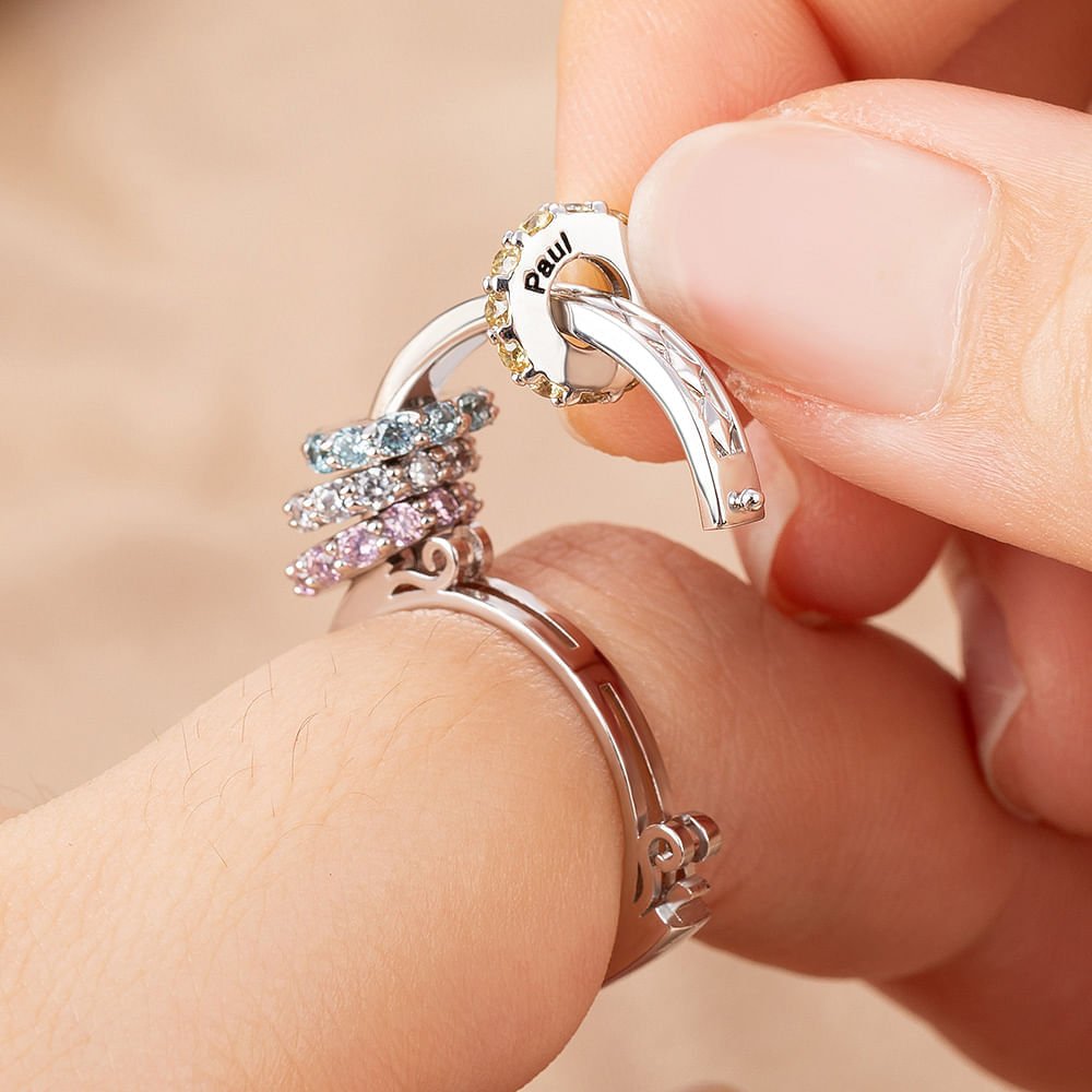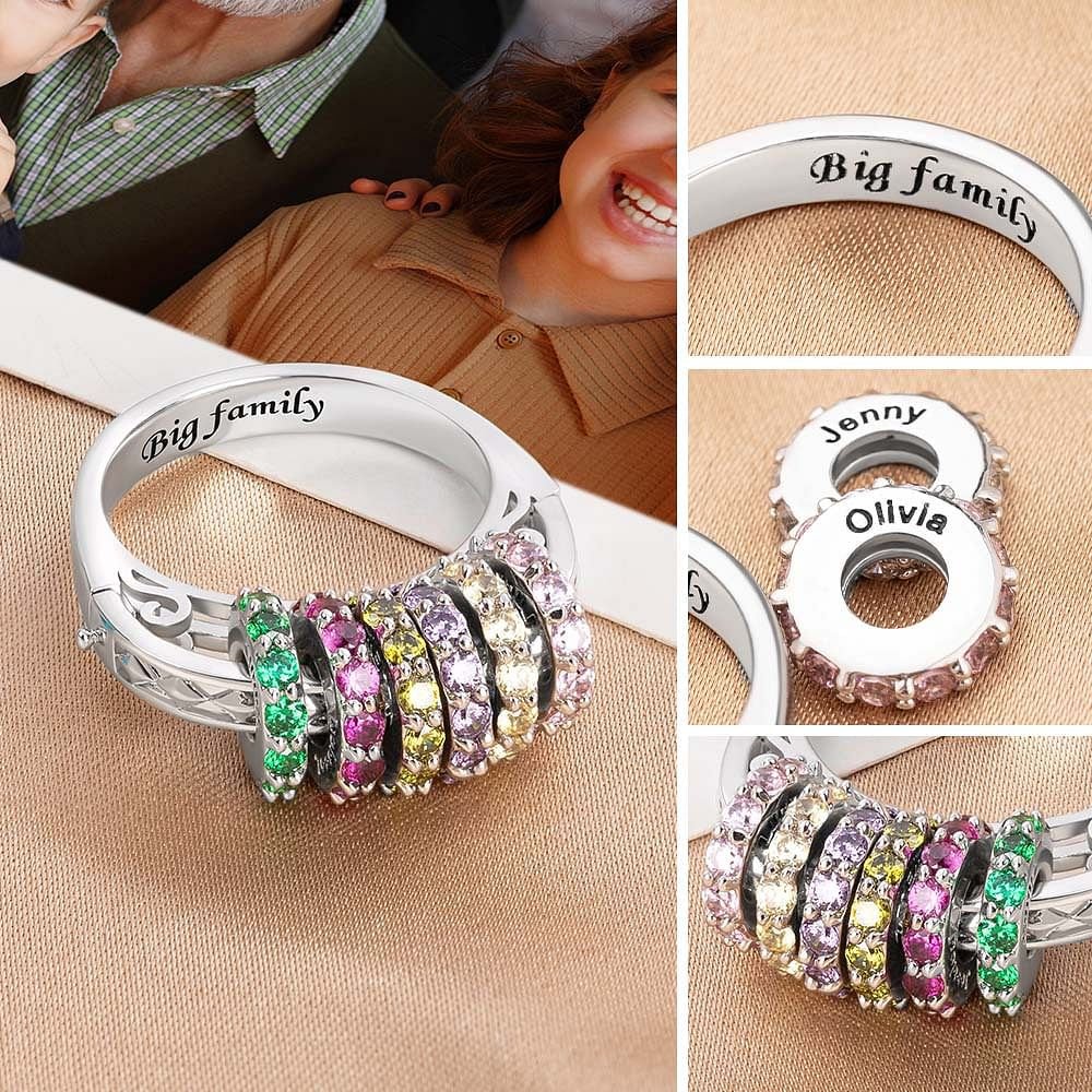 This Personalized birthstone ring is a beautiful representation of the unbreakable bond between a mother and her cherished children. Customize it with up to 8 birthstones, each engraved with the name of a beloved family member. The unique, one-of-a-kind design makes this ring a truly special keepsake.