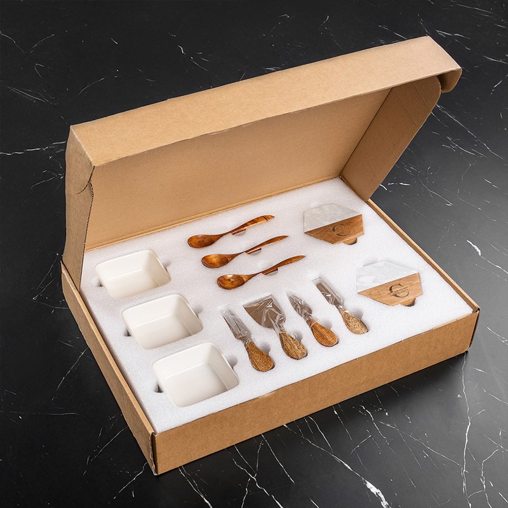 Elevate your gatherings with our striking 11-piece marble cutting board set. It includes 3 ceramic dip/side bowls, 3 wooden spoons, and a 4-piece cheese knife set—all matching the marble board perfectly. Great for displaying meats, cheeses, or appetizers, this set has everything to create a stunning party display and make your get-togethers more memorable.