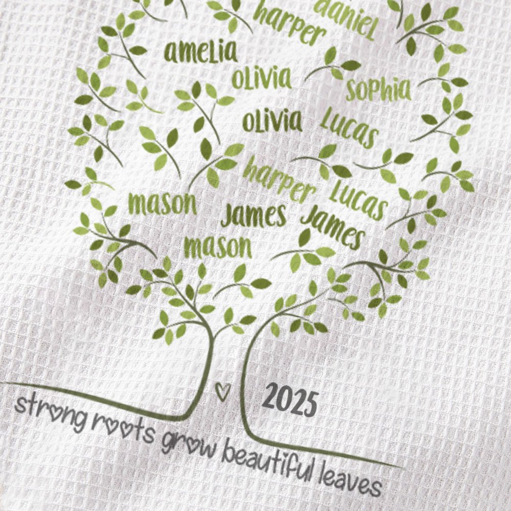 This Personalized tea towel features a beautiful family tree design, allowing you to add 2 to 20 family member names and customize a date and text to make it a unique family keepsake. It's a heartfelt way to celebrate family connections and makes a meaningful addition to any kitchen.