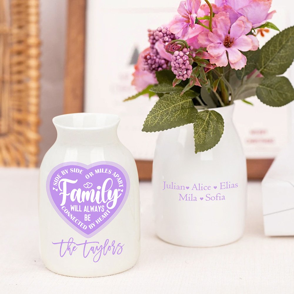Our Vase is designed with a heart pattern in the centre. The words "Family will always be connected by heart" surround the heart, showcasing the deep connection and love among each family member. To create a unique and meaningful family vase, you can customize 1-12 family members' names in the back of vase.