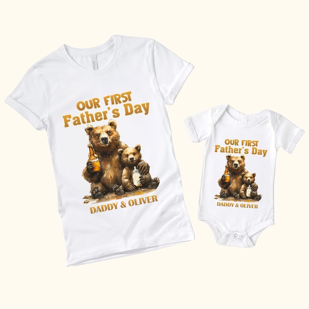 The T-shirt and the onesies showcase a cute "Dad bear and Baby Bear" design. Customize these adorable outfits with Dad's and baby's names, adding a personal style that makes them truly unique.
