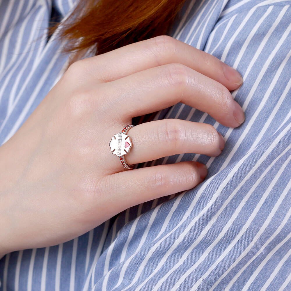 •The firefighter symbol is red colour. Used in women accessory, this gorgeous ring offers you a way to show your proud. The design has an abstract, concise, and striking feel, with glittering names adding unique Callie sparkle.