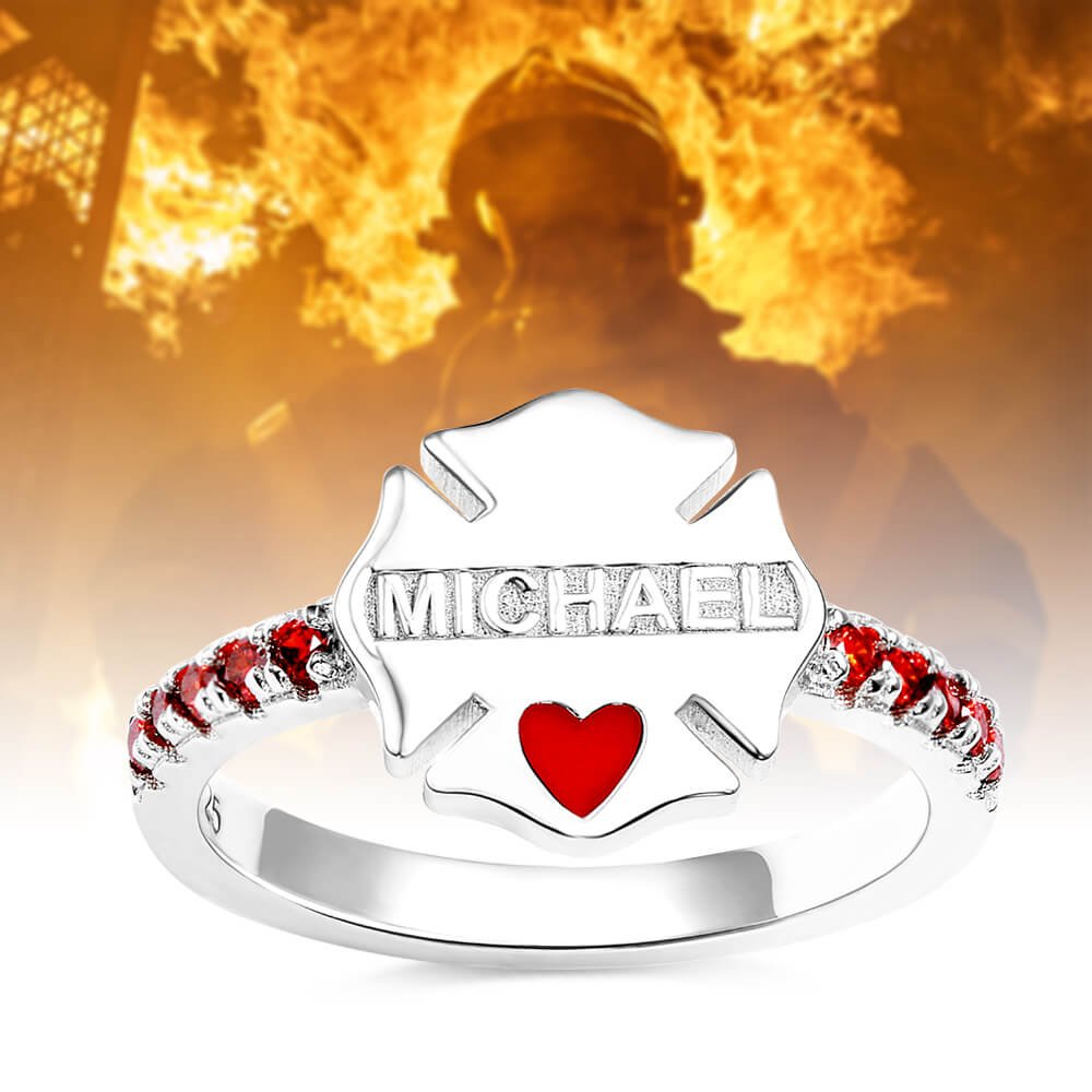 •This enchanting Callie name firefighter ring is an indispensable ring for jewellery lovers and firefighters’ mom or wife. Sparkling red birthstones’ array adorns the shimmering ring band and ring badge. The red heart is a classic design to show your love for the ring owner.