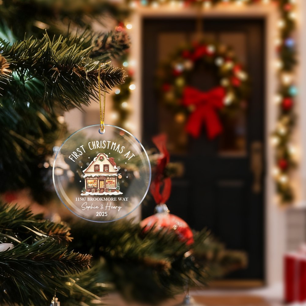 Featuring a snowy Christmas house motif, paired with the heartwarming message "FIRST CHRISTMAS AT," customizable with name, address, and year. The small, round design with a gold cord is elegant and festive, making it a unique keepsake to commemorate precious moments.
