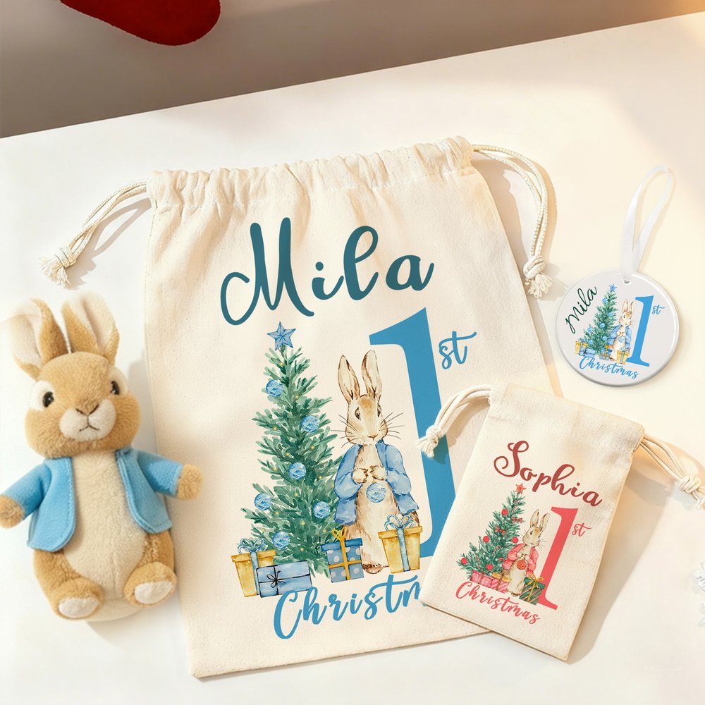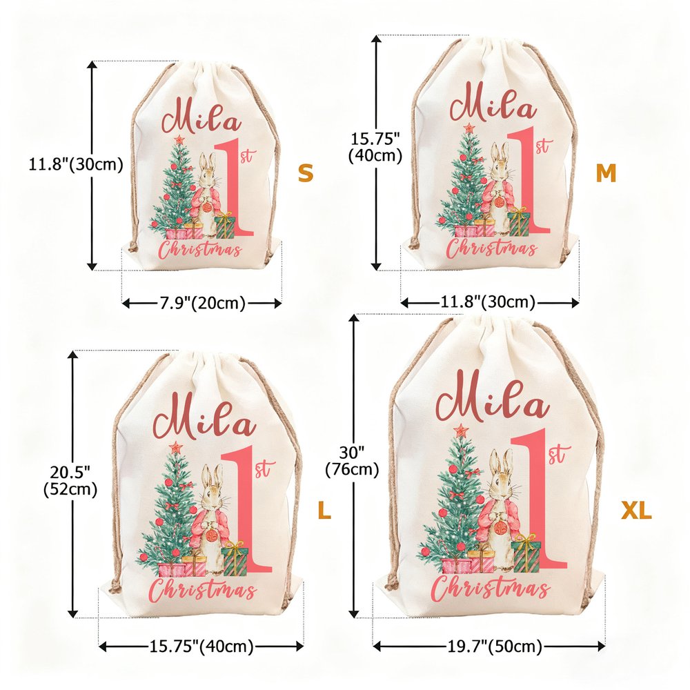 Personalized First Christmas Santa Claus Peter Rabbit Drawstring Canvas Gift Bag with Name Christmas Gift for Baby Family