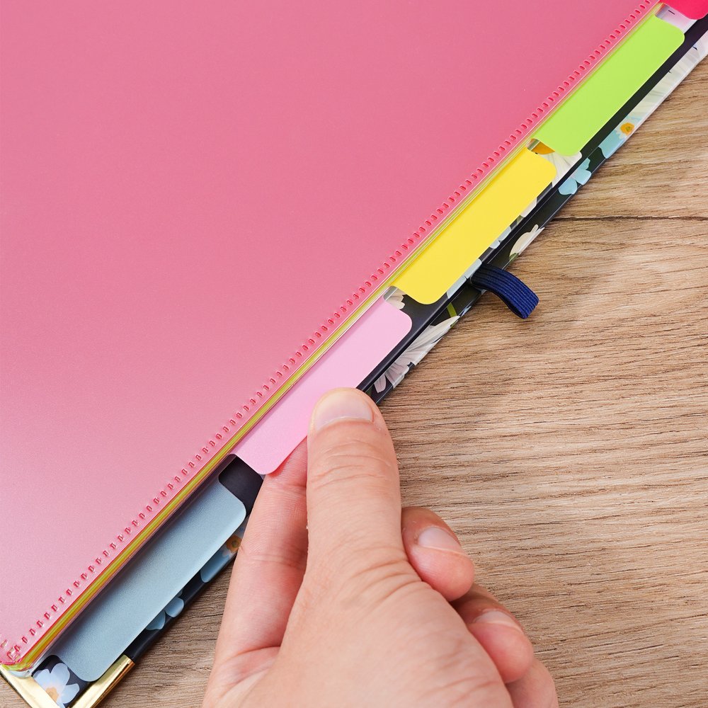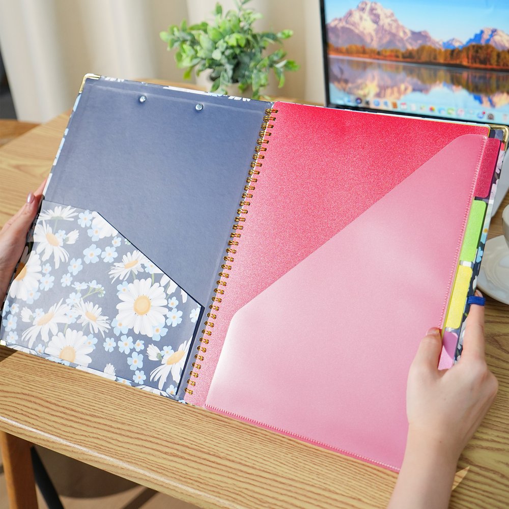 It features a durable, unbreakable PP inner cover, lined with pockets, and five file pockets for organizing and filing documents, eliminating clutter. A built-in pen loop provides easy access to pens and prevents loss. The durable, wear-resistant material withstands frequent daily use.