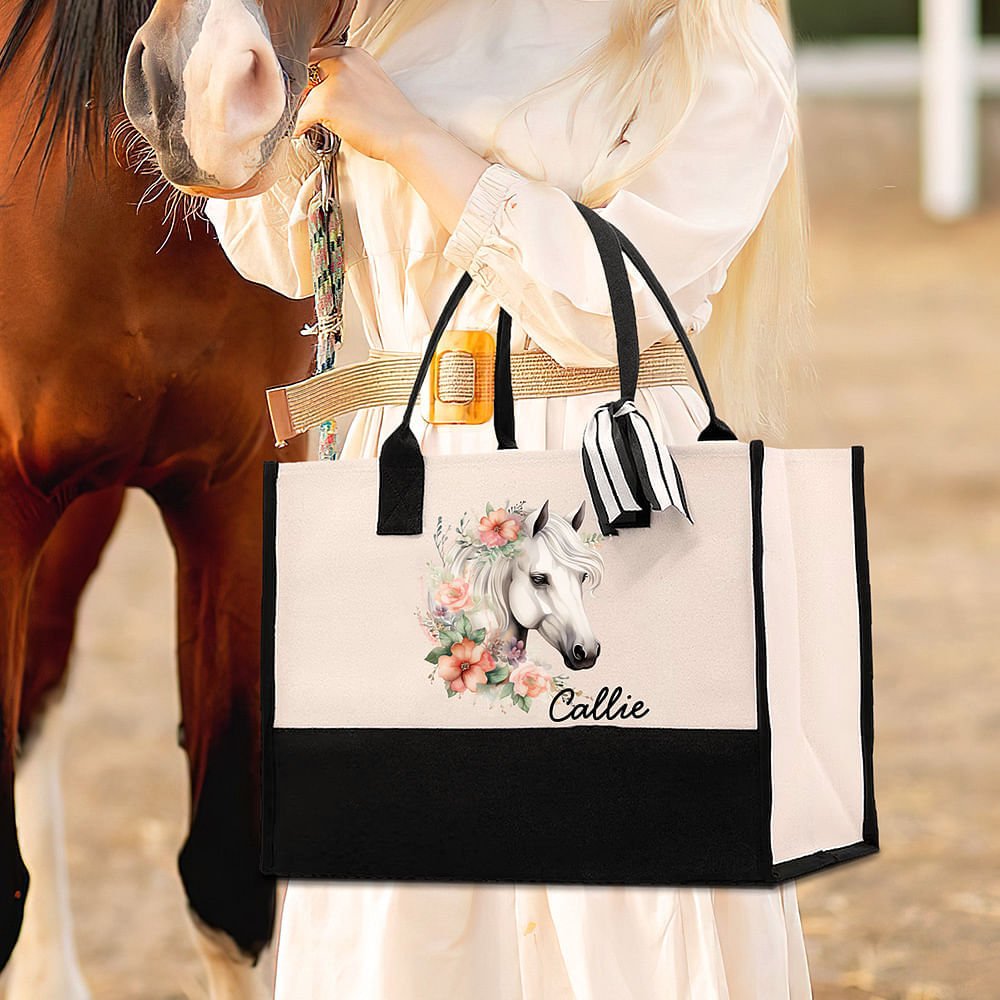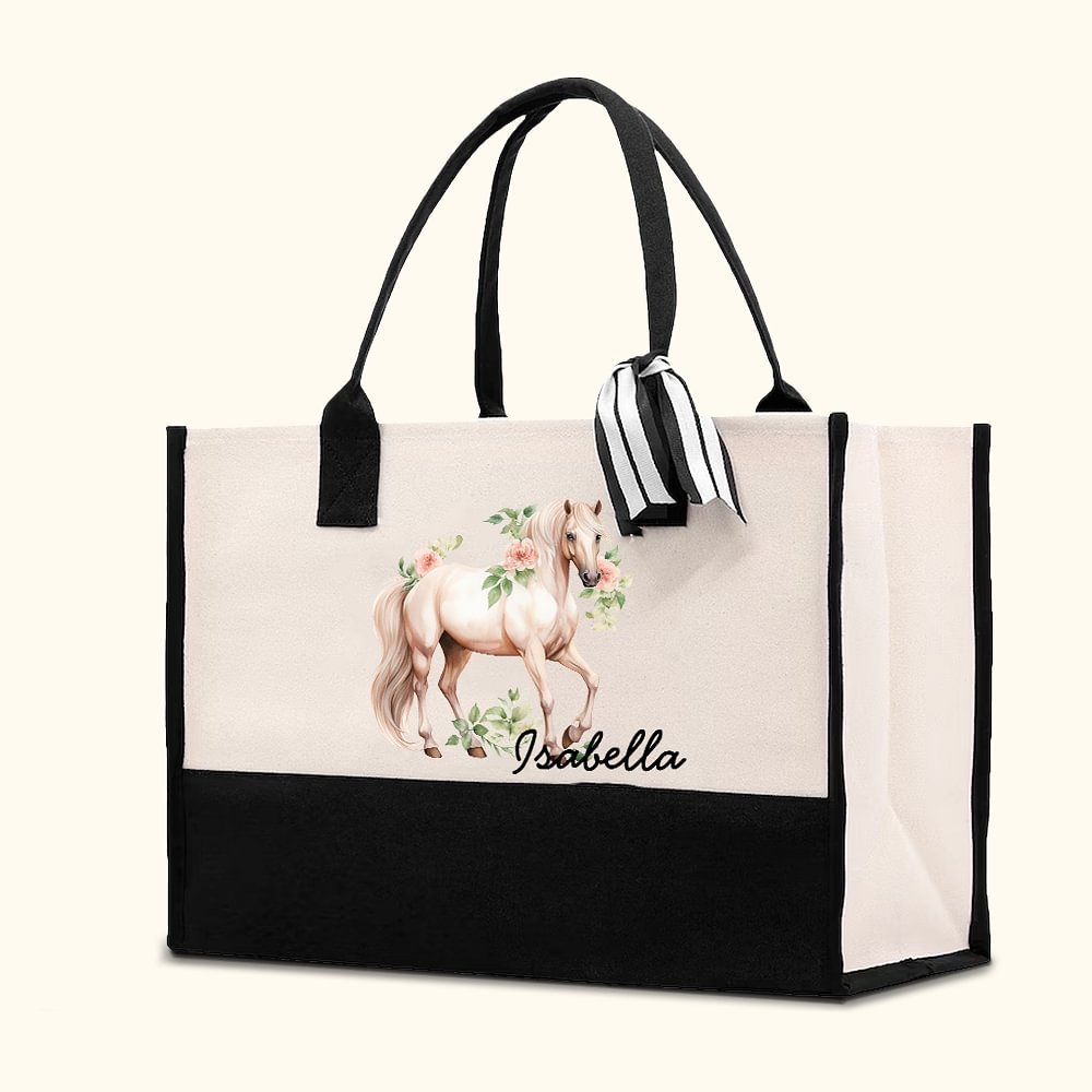 This tote bag has exquisite horse illustrations printed on the front. There are sixteen kinds of horse patterns to choose from. The horses in each pattern are dotted with different flowers, showing nature and elegance—the perfect combination. Your name can be printed on the front, which is a way to express your personality.