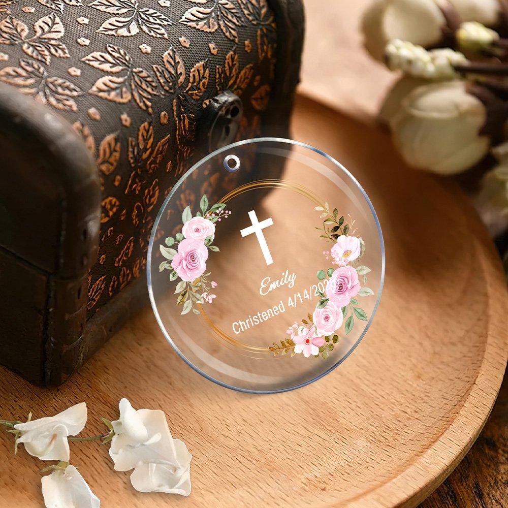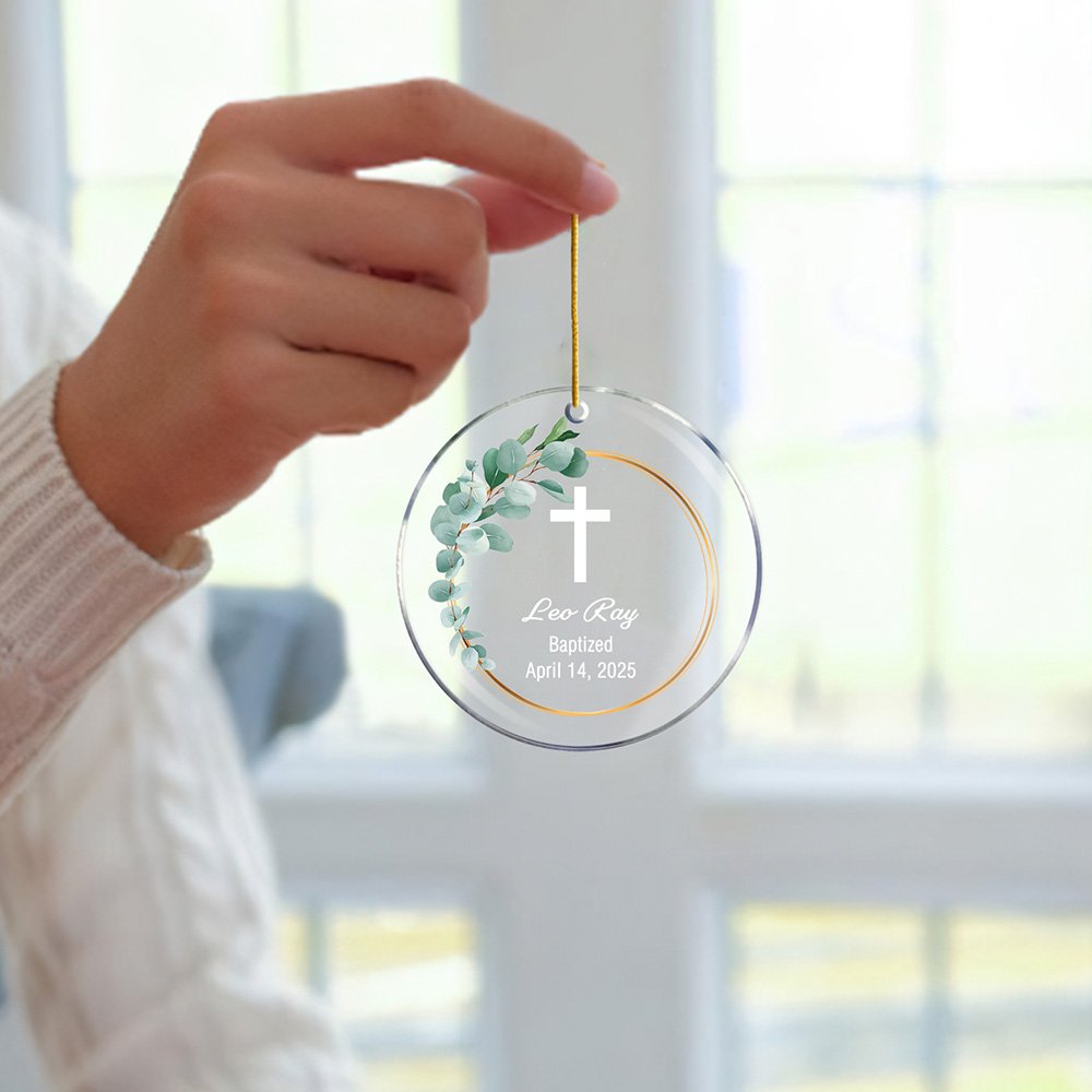 This round acrylic ornament features a stunning design of a cross complemented by delicate floral and leaf motifs. Personalise it with a name and date, making it a unique keepsake that commemorates special moments in your loved one's life.