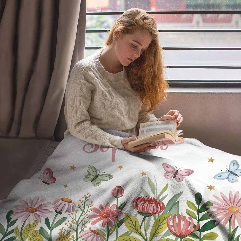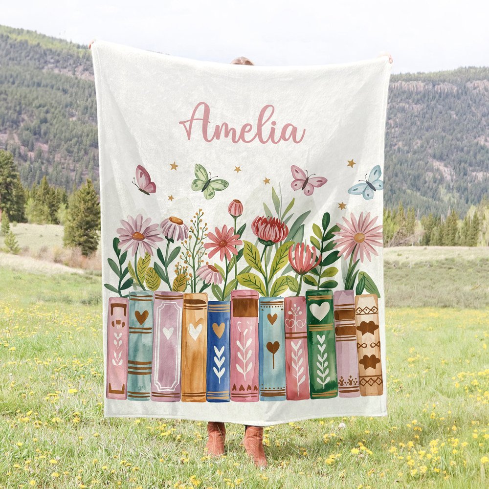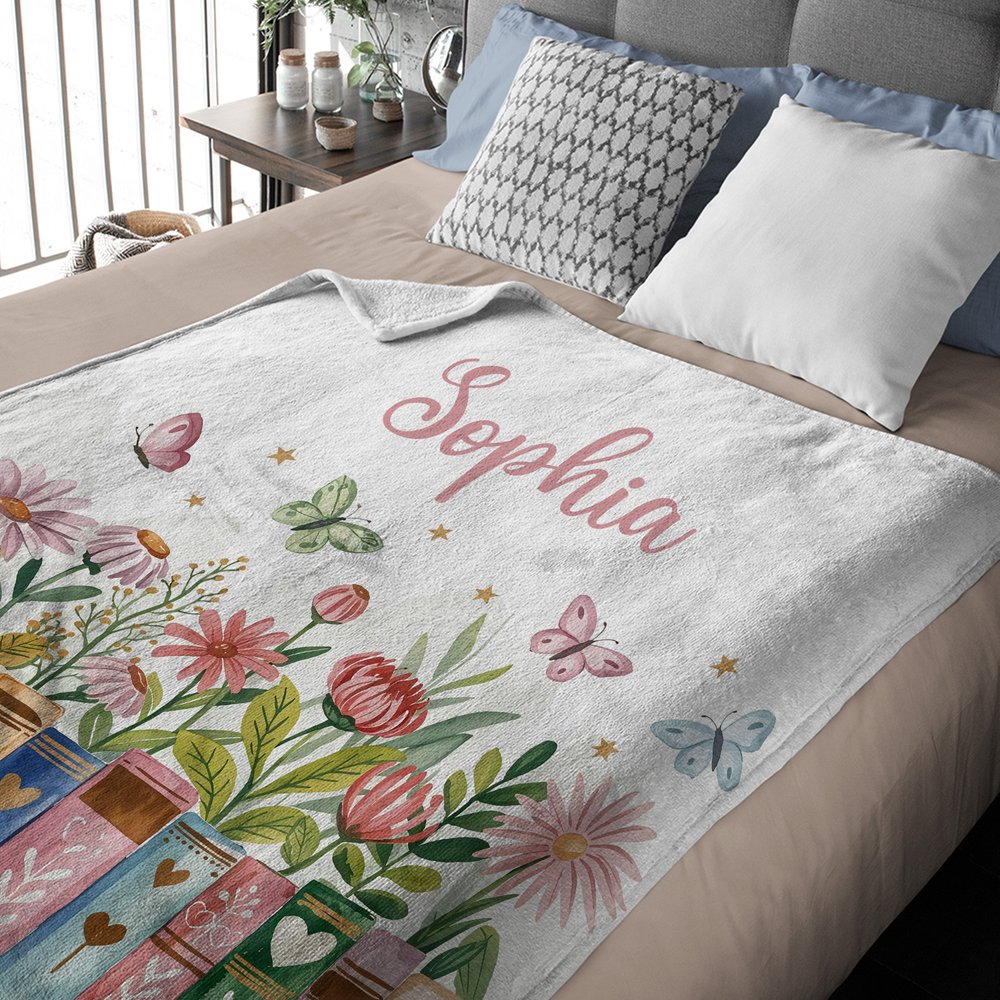 Centreed around a watercolour-style stack of books, this design incorporates elements like flowers, butterflies, and stars. It also offers customizable names, creating an overall aesthetic brimming with artistic flair and adorable charm. The fresh colour palette perfectly complements the book theme, intuitively resonating with book lovers' preferences. The personalized name elevates the blanket beyond ordinary decorative pieces, transforming it into a one-of-a-kind, exclusive item.
