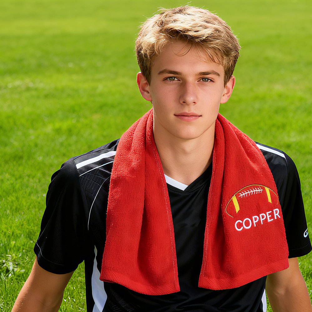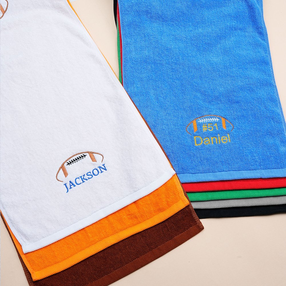 The towel features exclusive football-themed design elements, offering customizable names and numbers. Players' names, jersey numbers, and other personalized details can be seamlessly integrated with football motifs through intricate embroidery techniques. This transforms each towel into a “one-of-a-kind athletic emblem,” catering to personalized use and commemorative needs.