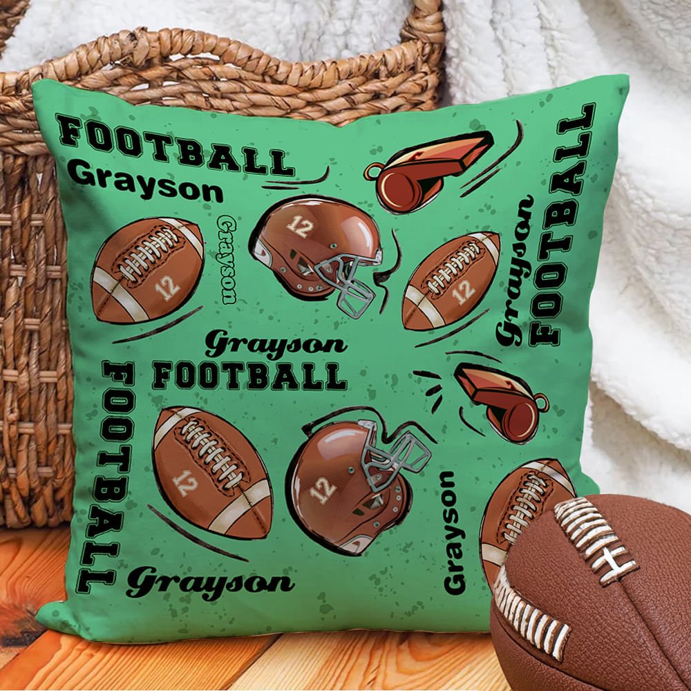 This throw pillow cover features a football design complete with football helmets and whistles, allowing you to customize it with your name and favorite number. It's a fantastic way to express your passion for football.