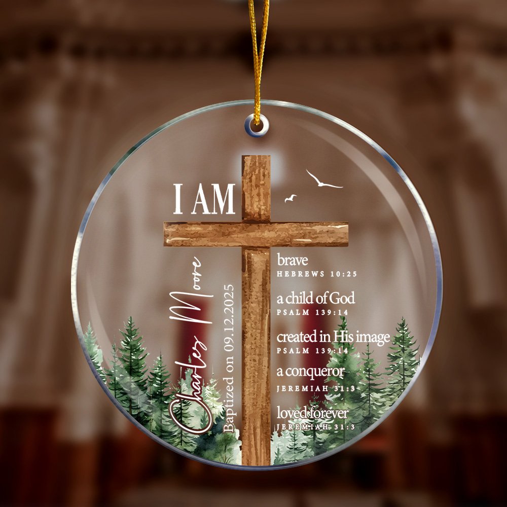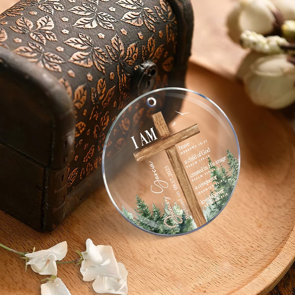 The centre of our ornament is a wooden cross with the positive words "brave, a child of God, created in His image, a conqueror, loved forever" printed on one side of the cross. These texts are quoted from different passages in the bible and express personal beliefs. The other side of the cross is printed with a customizable name and text, making it even more memorable.