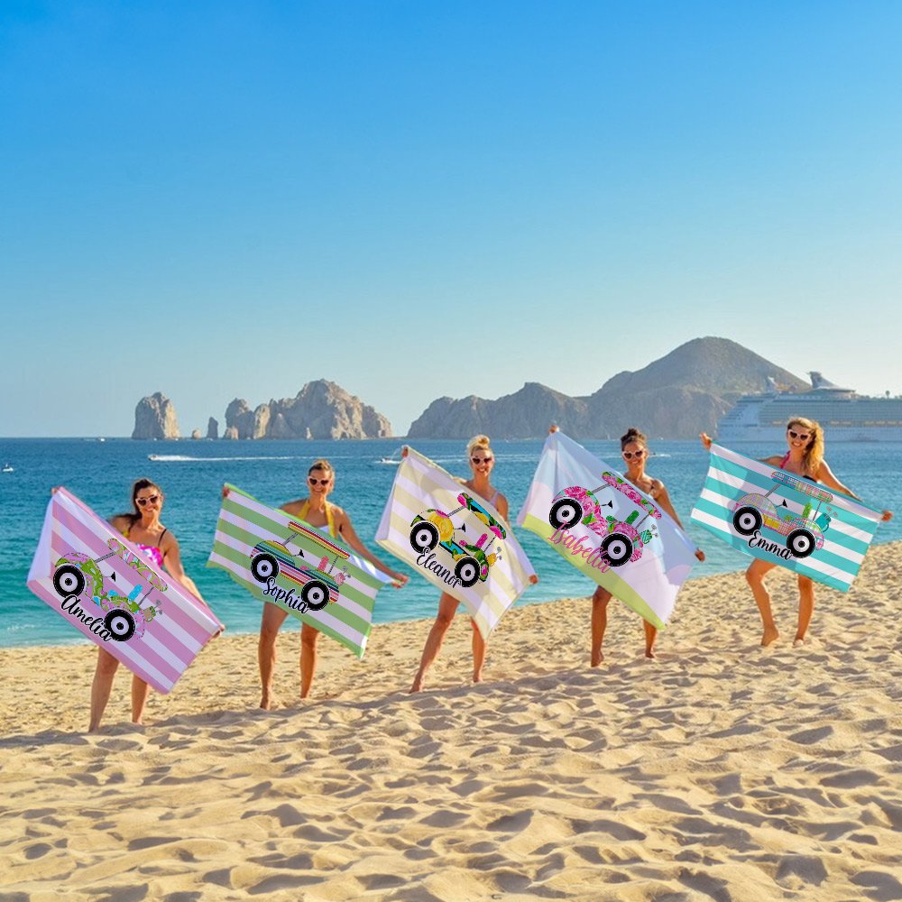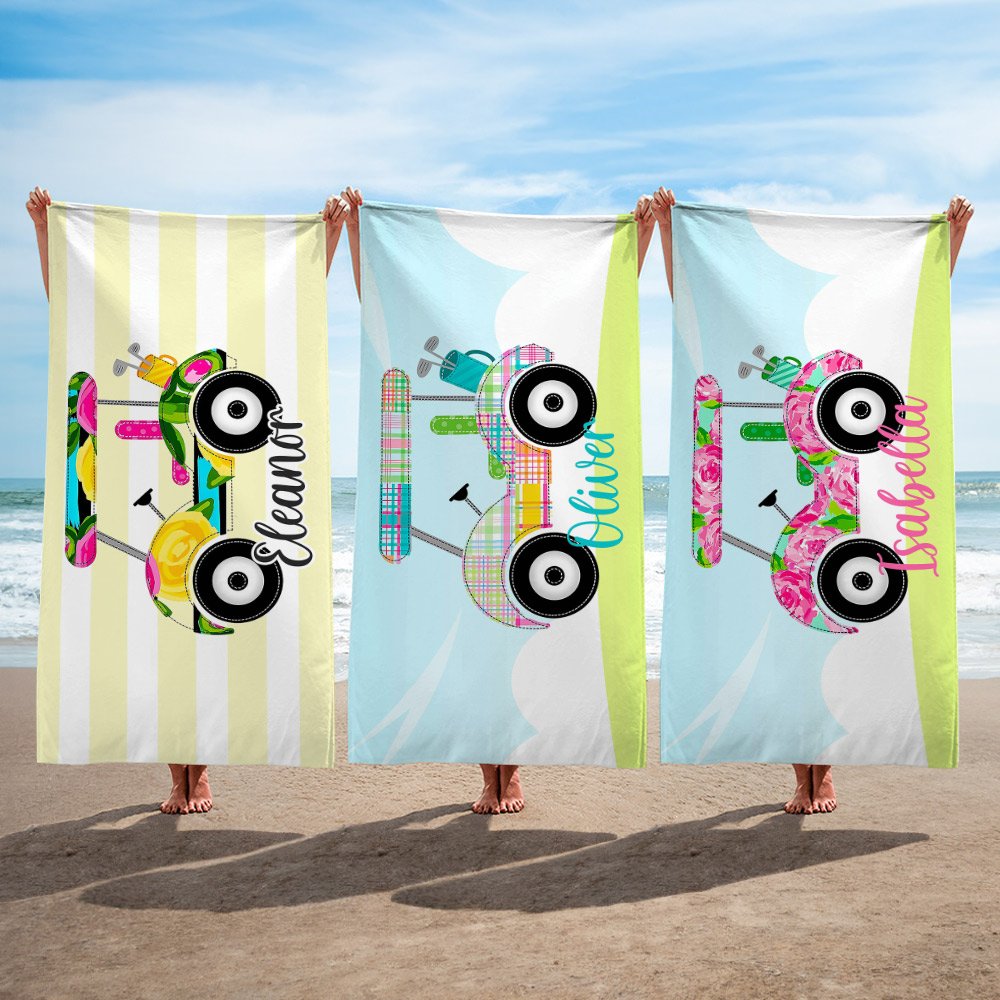 Personalized Golf Cart Stripe Oversized Quick Dry Beach Towel with Name Travel Accessory Birthday Gift for Golf Lover