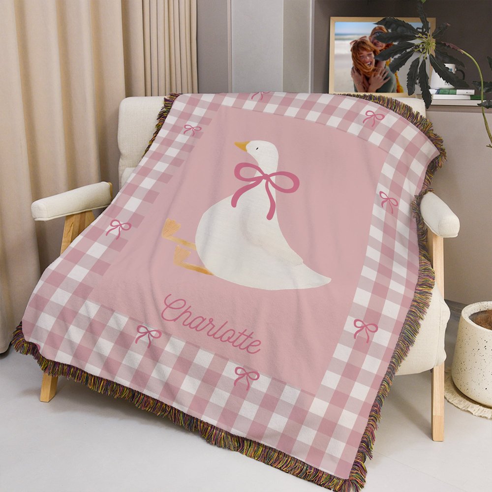 This fringed blanket features a soft blue and pink plaid pattern, adorned with an adorable baby goose with a bow in the centre, creating a dreamy, fairytale-like atmosphere. Printing your baby's name on the blanket adds a unique and heartwarming touch, making it a precious keepsake of your love and care.