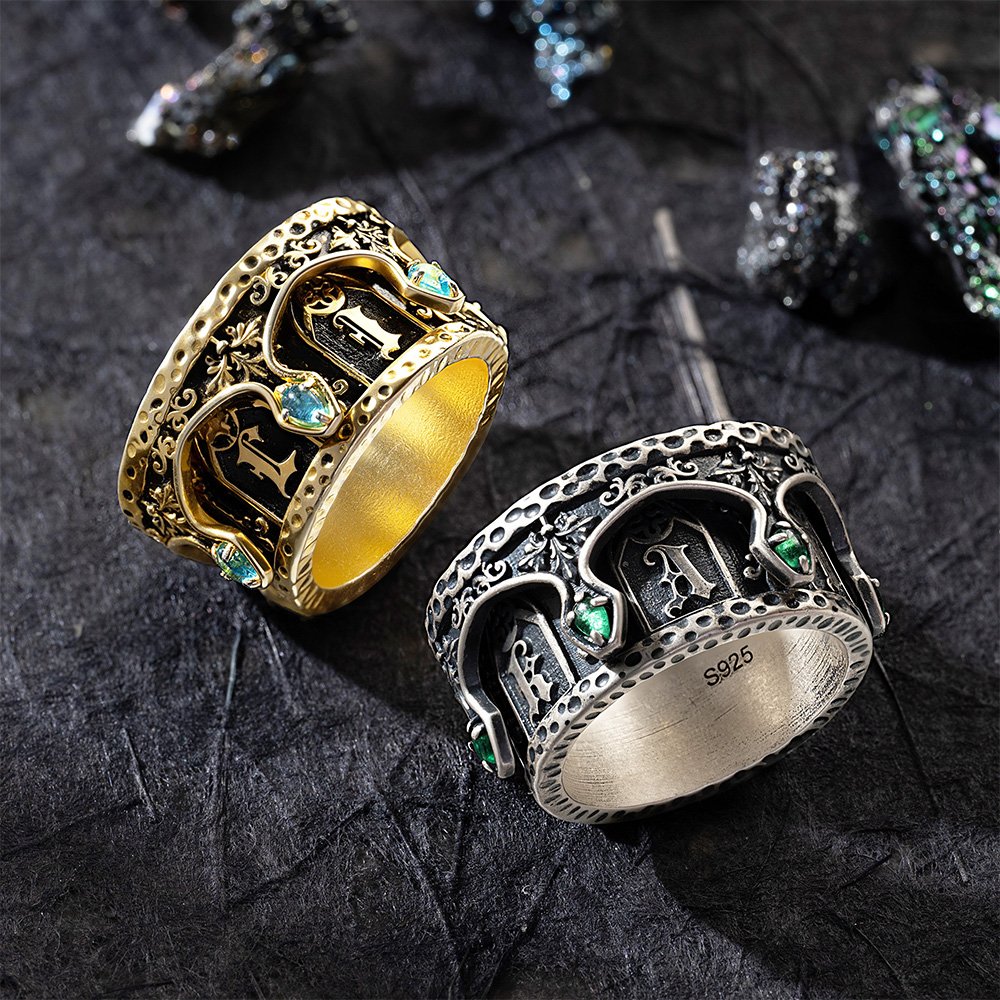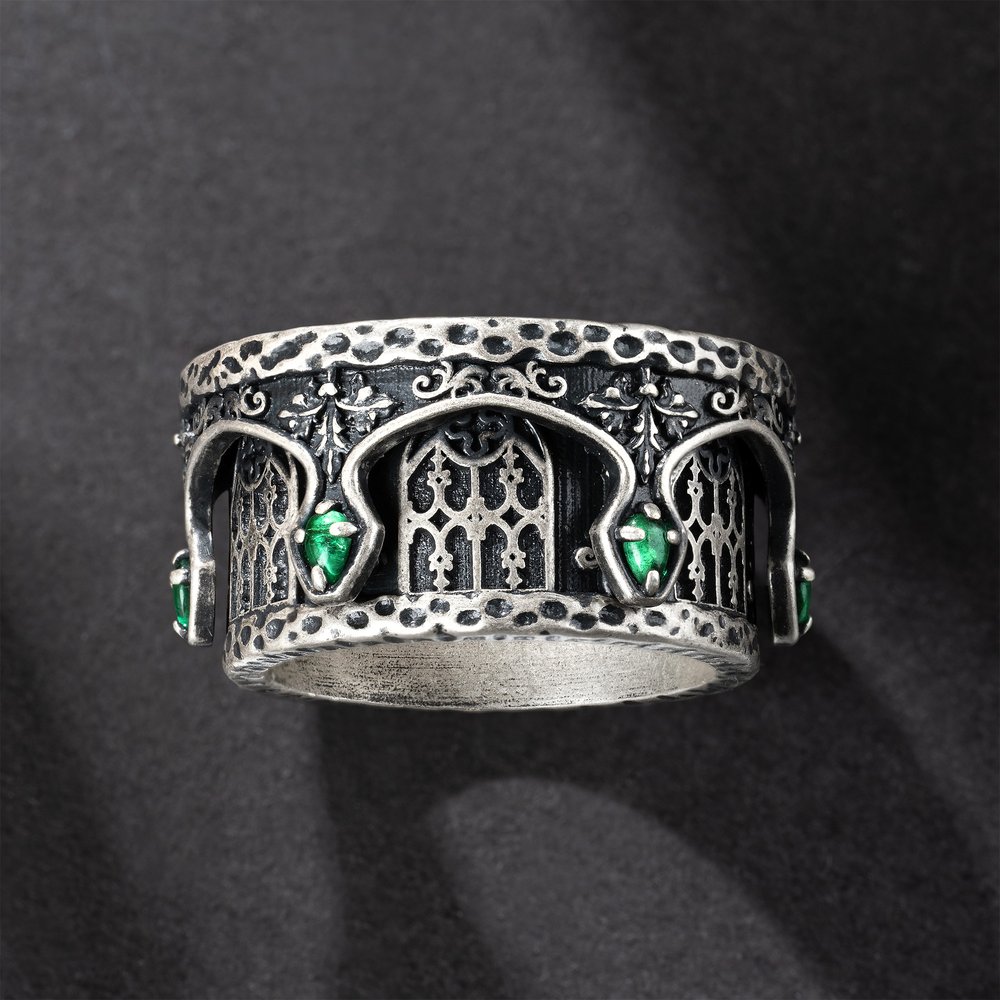 This custom church-inspired ring beautifully blends typical elements of church architecture with personalized features. The design incorporates intricate window motifs. The stylized font integrates the user's initials and birthstone into the design, making their characters an integral part of the overall aesthetic, resulting in a diverse and meaningful piece. Also, the outer layer of this ring can rotate around the finger.
