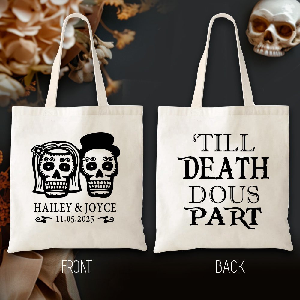 Customize this sugar skull tote bag with the newlyweds' names and wedding date, transforming it into a treasured keepsake. It’s a beautiful way to commemorate their special day and celebrate their love.