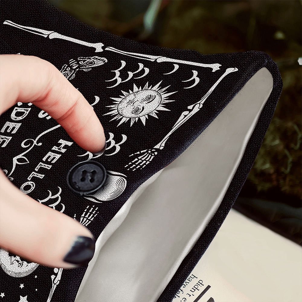 This extraordinary book sleeve is a must-have for all bookworms and Ouija enthusiasts! The moment you lay your eyes on it, you'll be captivated by its unique and spooky design. The combination of the Gothic sun and moon and the intricate skeleton details creates an atmosphere of mystery and intrigue. The Ouija board pattern adds an extra layer of enchantment, making it stand out from ordinary book sleeves.