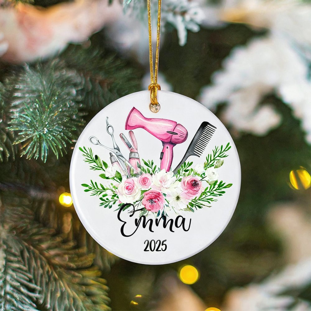 This ornament features a detailed salon tools design, including a hairdryer, comb, and scissors, along with festive string lights or florals. You can customize it with a hairstylist’s name and the year, turning it into a unique, profession-inspired keepsake that celebrates their craft.