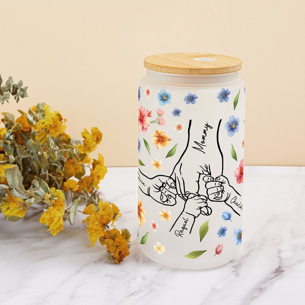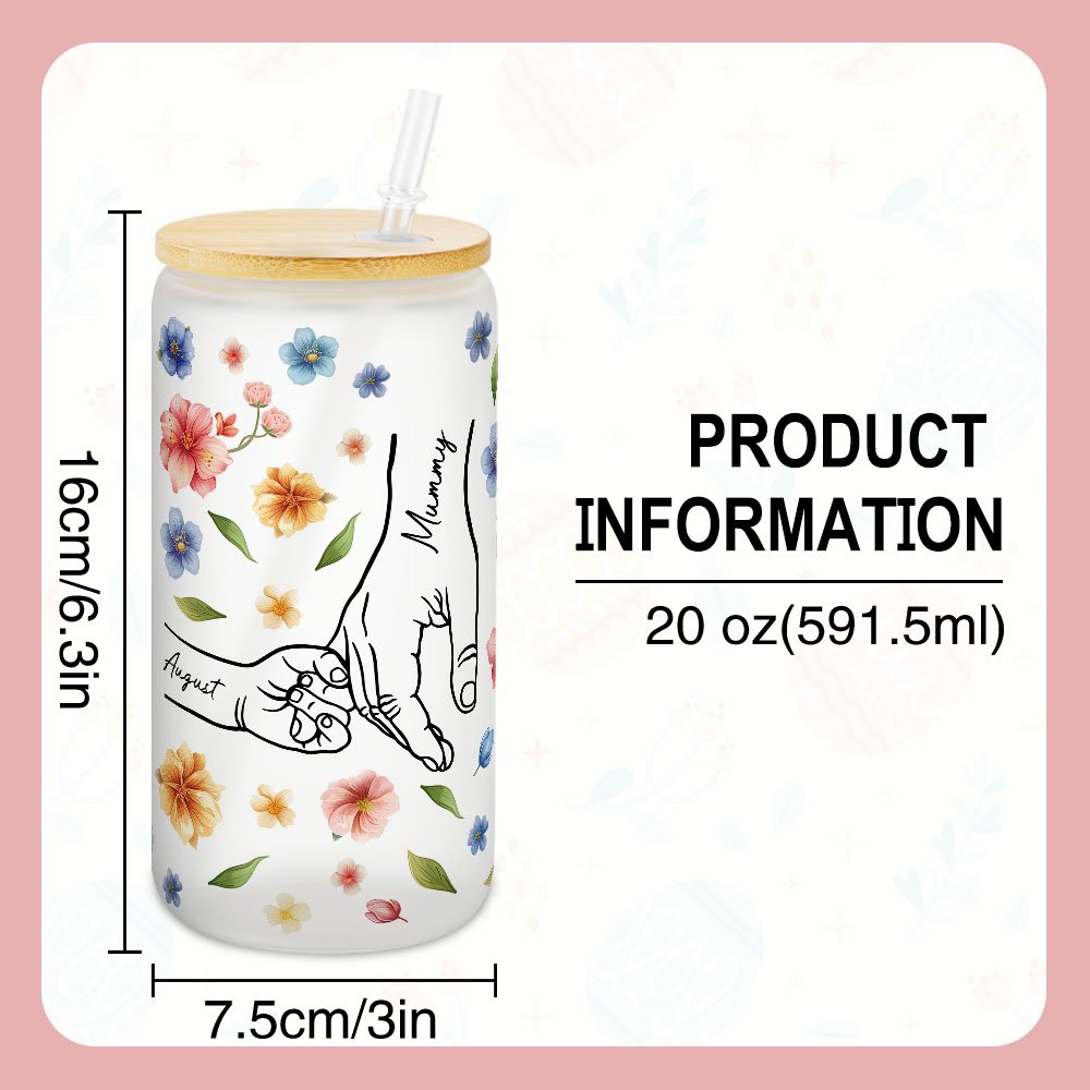 The glass tumbler stands out with its distinctive design. It portrays the touching concept of small hands gripped tightly in larger ones, symbolizing growth under the shield of love, paying tribute to mothers, grandmothers, or aunts.