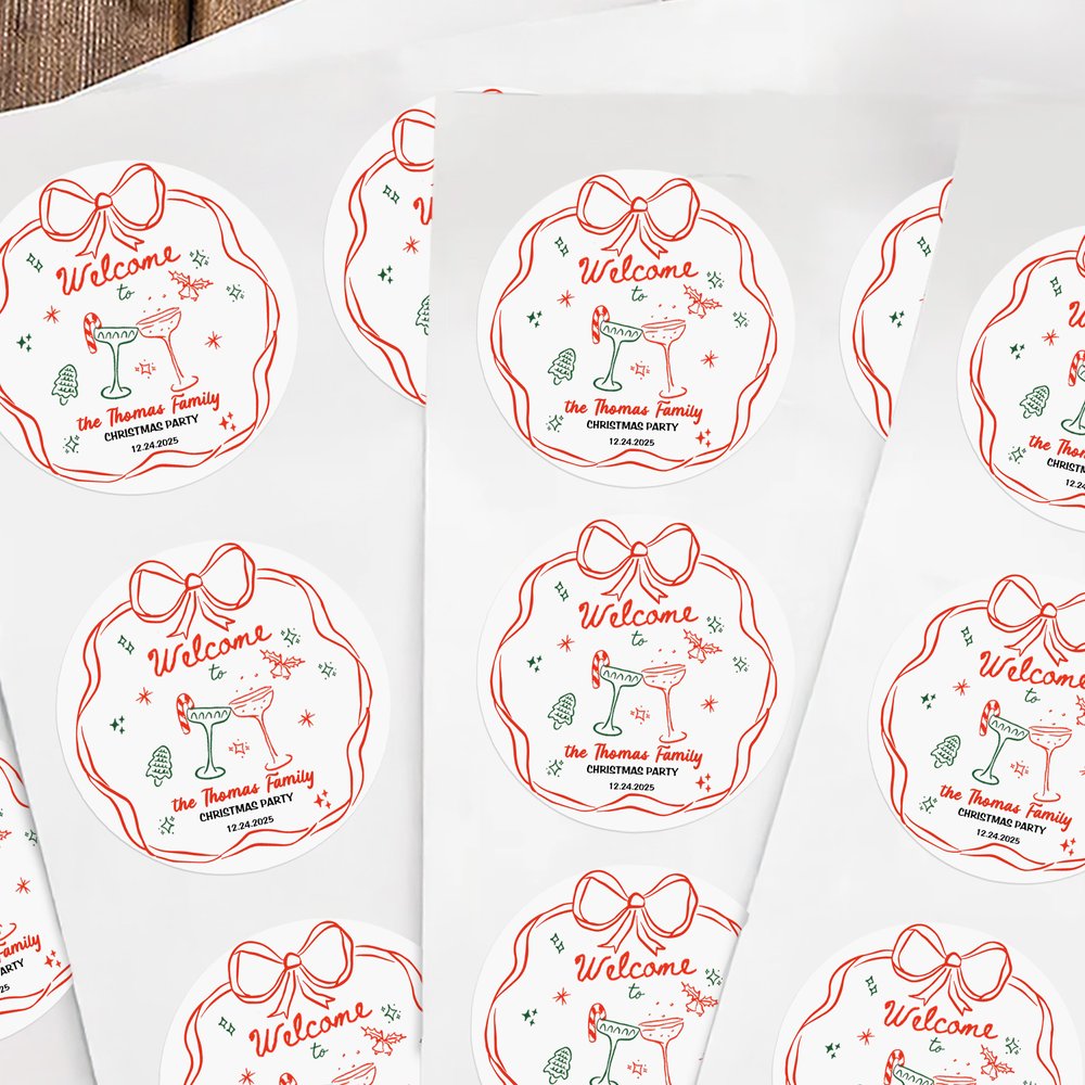 This sticker showcases a hand-drawn style as its central design element, with flowing lines that resemble the delicate trails of falling snow in winter. Accompanied by festive motifs such as Christmas trees, cocktail glasses, and wreaths, it captures the essence of a warm Christmas party in a compact form. The sticker also offers customization options for family names and party dates, making it a truly unique keepsake.