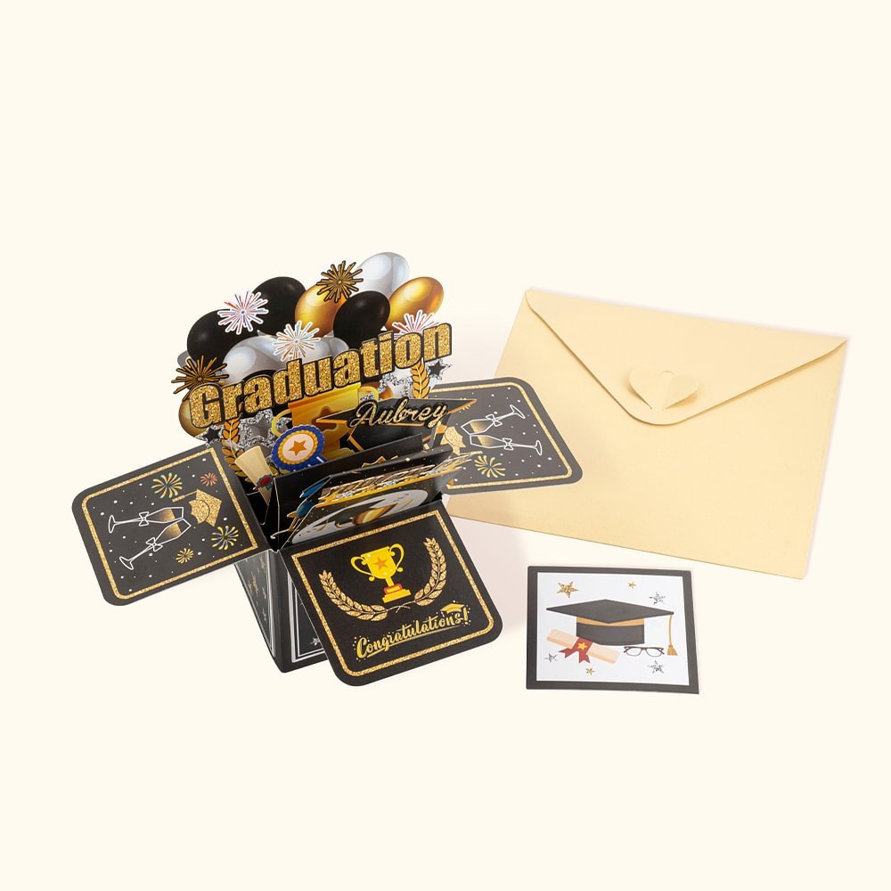 Make the graduation occasion truly memorable with our unique 3D pop-up graduation card. This card stands Out with its classic black and gold design, adorned with iconic symbols like graduation caps, diplomas, stars, and heartfelt congratulations greetings. The combination of these elements creates a design that is both timeless and elegant, capturing the excitement and pride of graduating in a way that traditional cards can't.