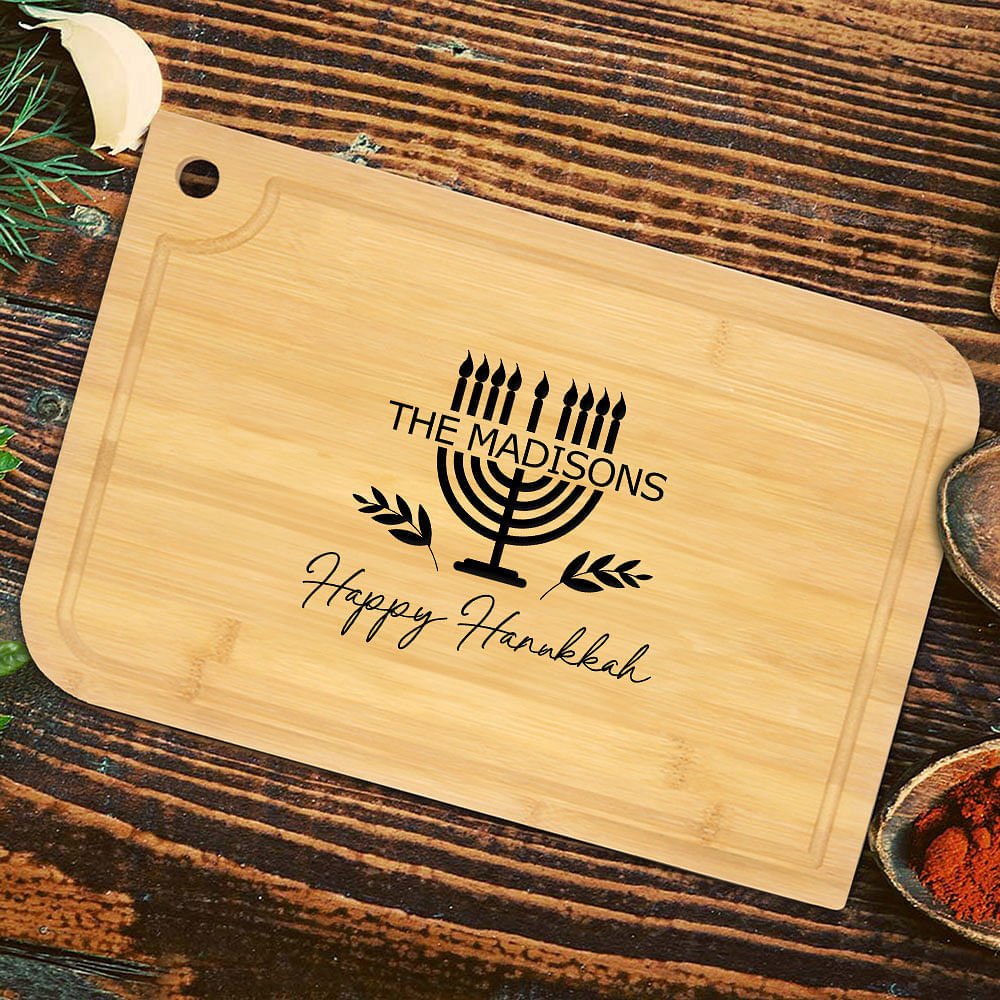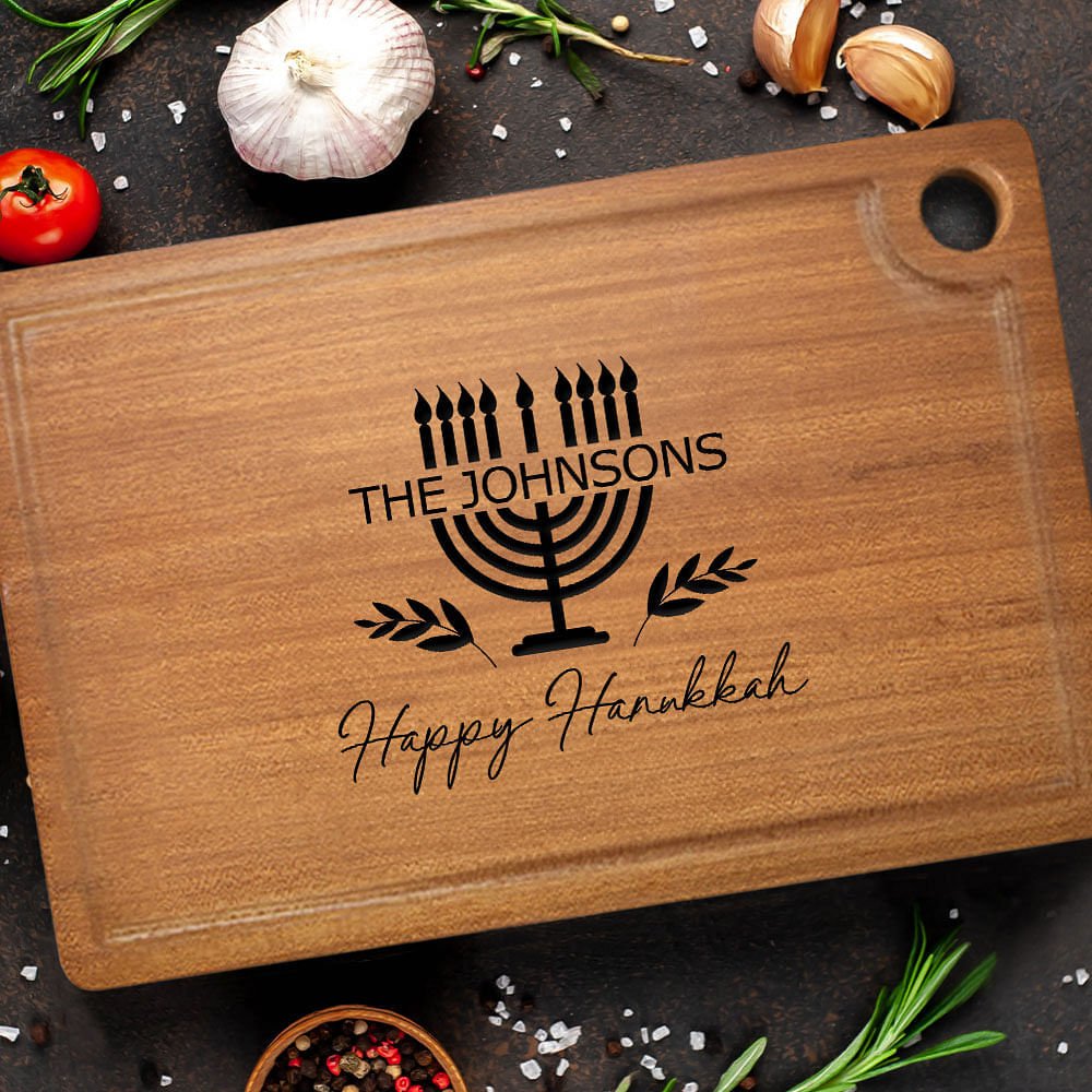 The unique nine-branch candlestick pattern is paired with branches, which symbolize light, hope, and rebirth. This Personalized wooden cutting board is the perfect accessory to bring the Hanukkah spirit into your kitchen. The engraved text and menorah design pay homage to the Jewish holiday.