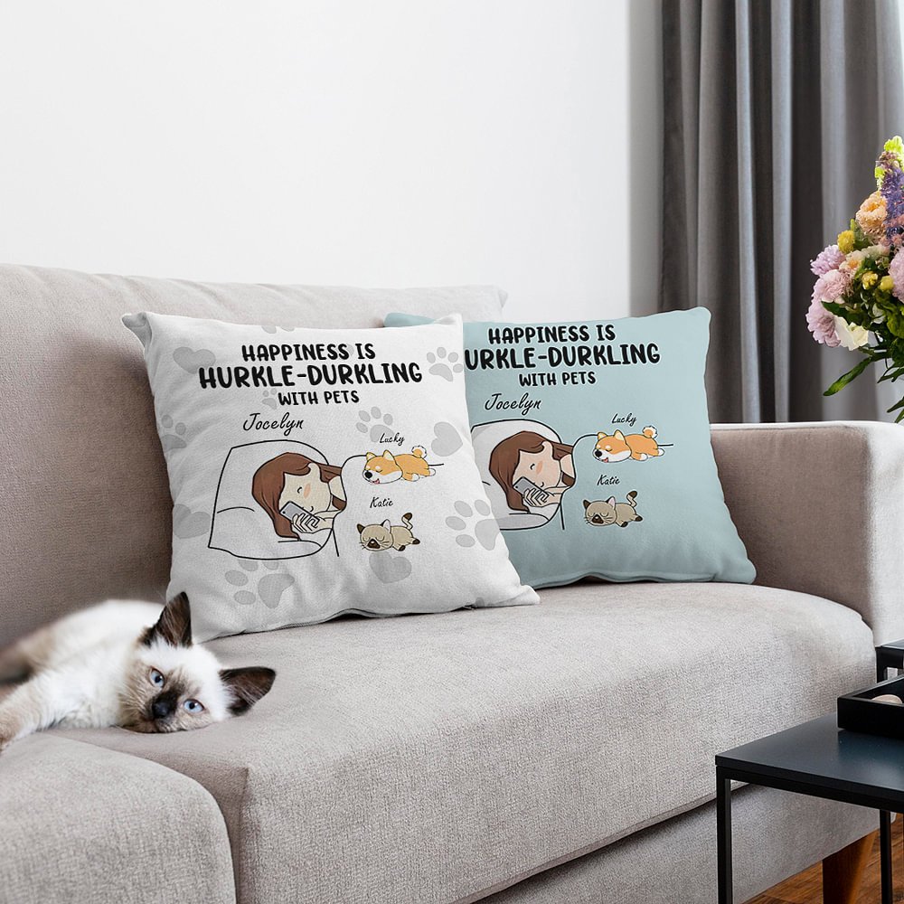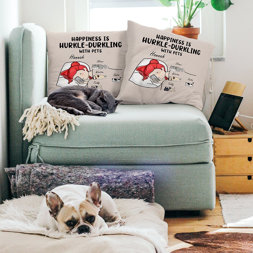 This Personalized throw pillow cover is a special gift for pet lovers. The special quote "Happiness Is Hurkle Durkling With Pet" is printed on it, and you can customize the name to celebrate their love for their furry companions.