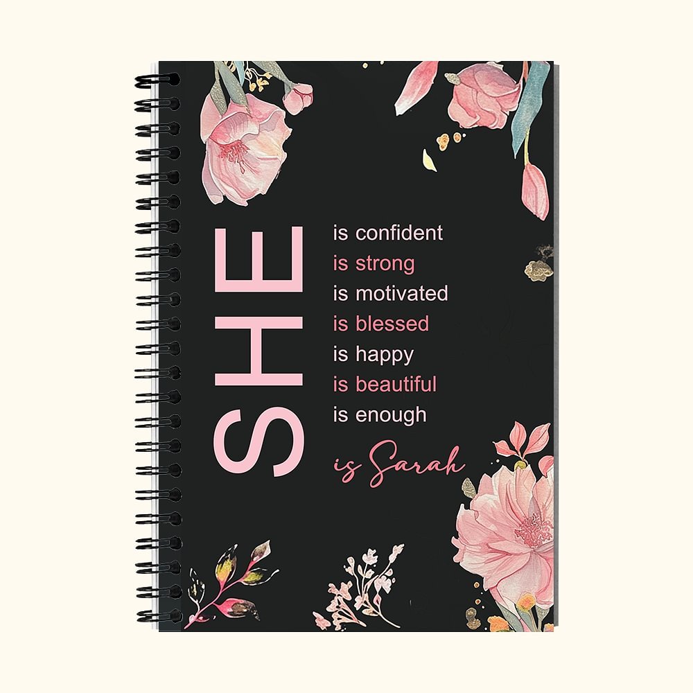 "She is confident/strong/motivated/blessed/happy/beautiful/enough," boldly printed on the cover. This notebook serves as a daily affirmation, encouraging her to embrace her personal power and tenacity in all aspects of life.