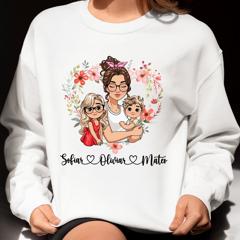 Personalized Heart Shaped Wreath Cartoon Mom and 1-2 Kids Skin-friendly Sweatshirt Hoodie with Name Birthday Mother's Day Gift for Mom Grandma