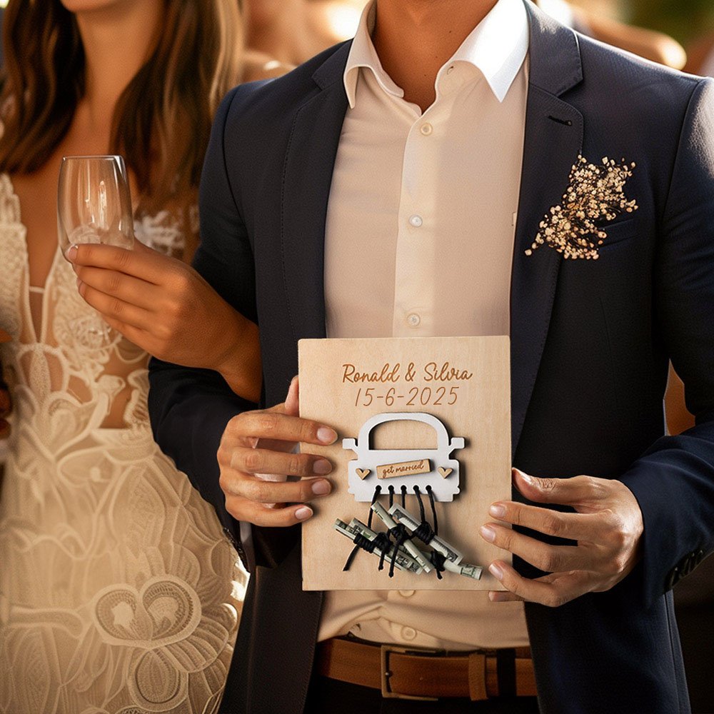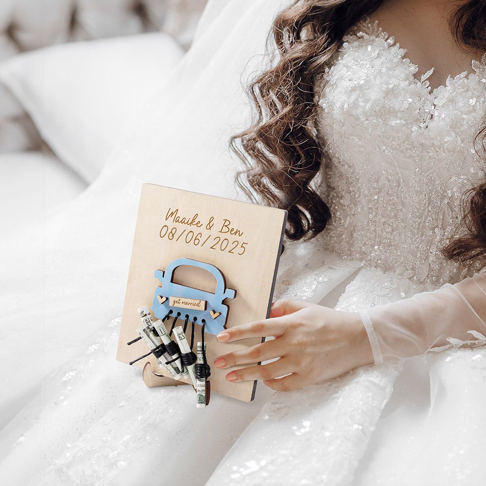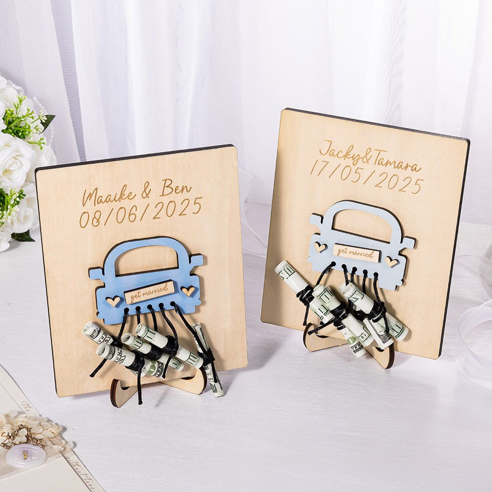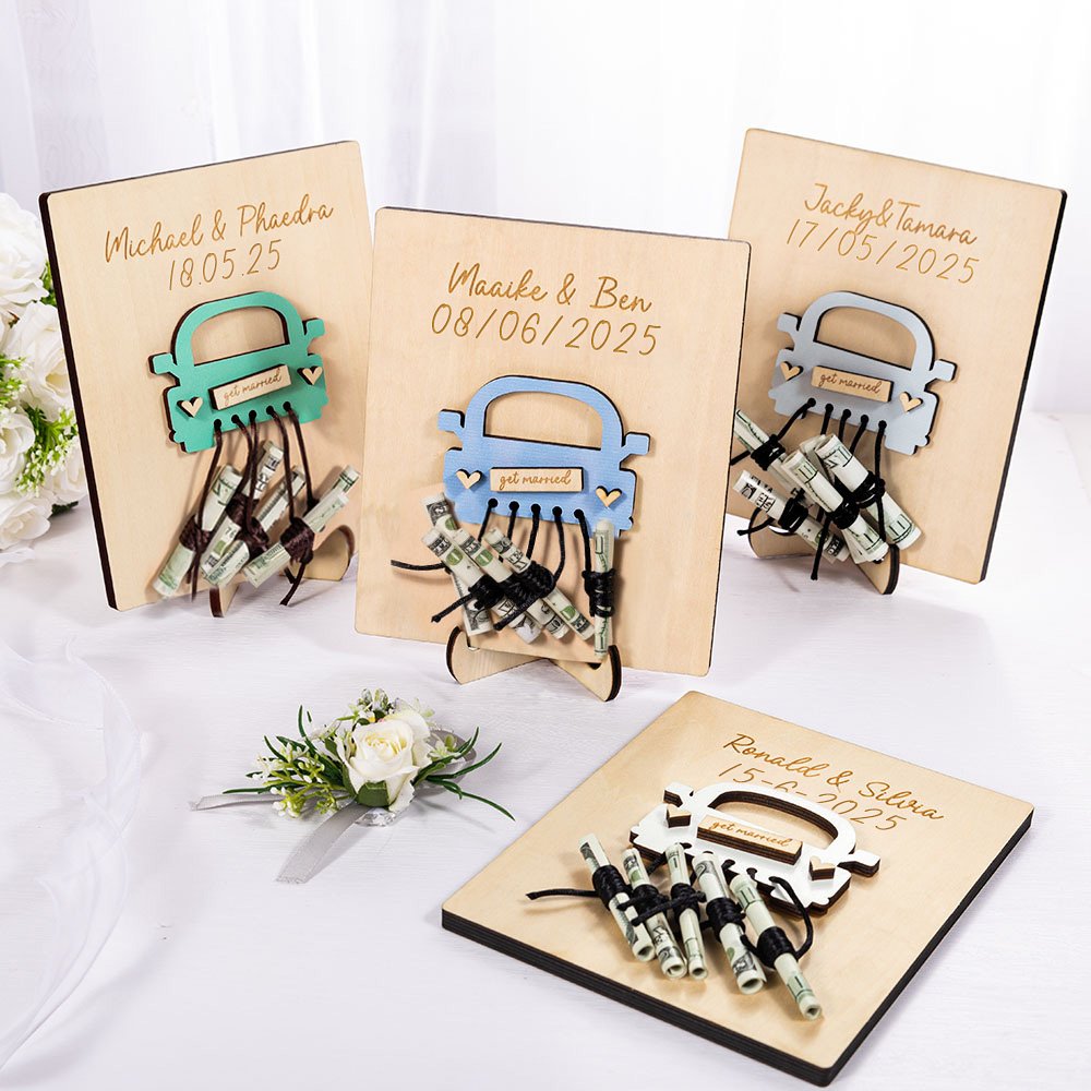 The wedding car pattern on the money holder is cleverly carved into the wood, symbolizing the couple's new phase and their happy future. Both the front and back of the money holder can be customized to leave your best wishes.