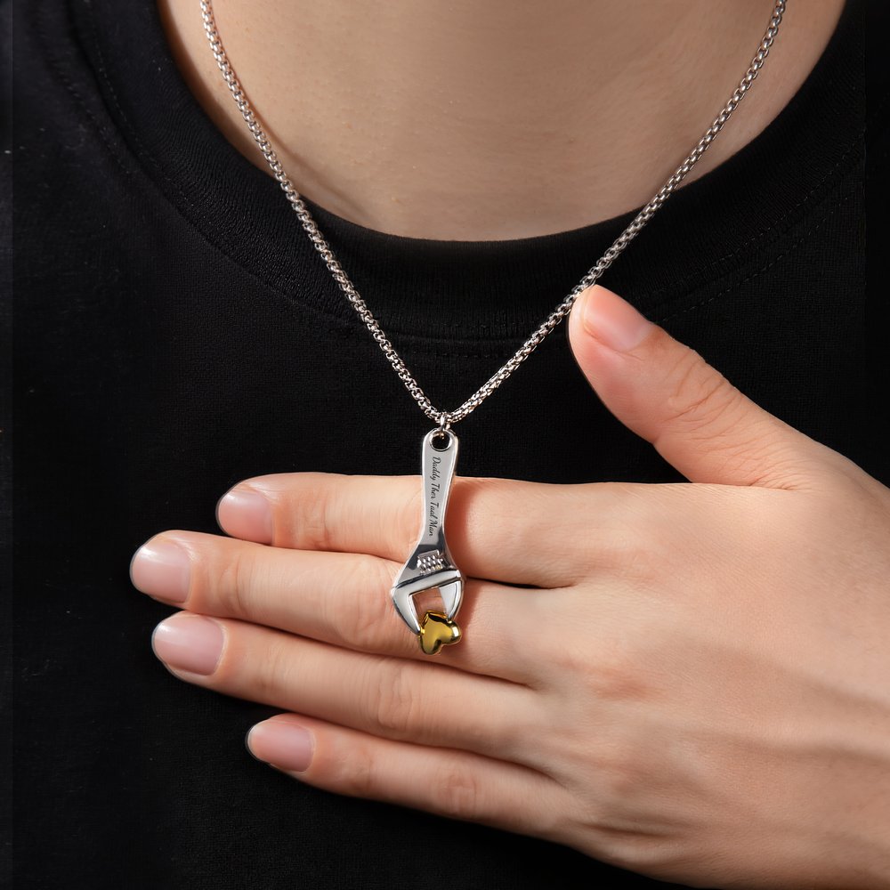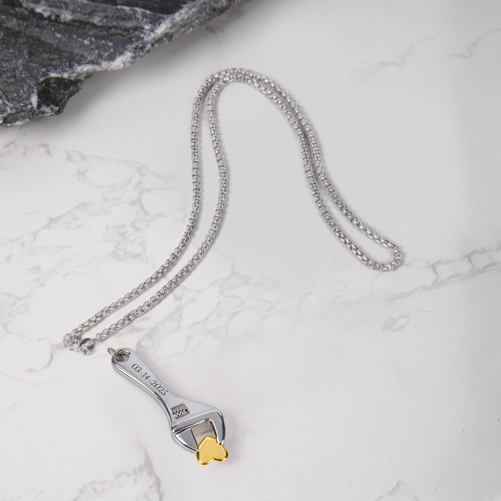This necklace features a Spanner holding a heart as its primary design element, symbolizing the profound meaning of "repairing a broken heart" and "protecting memories." The pendant's sleek lines are simple yet powerful, and every detail is imbued with emotion. Custom engraving is available, allowing you to engrave a name, date, or commemorative message, creating a lasting memory.