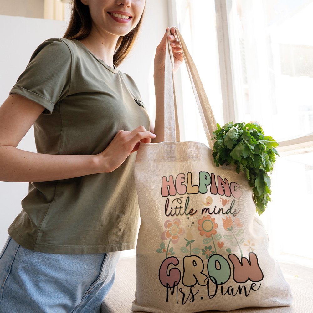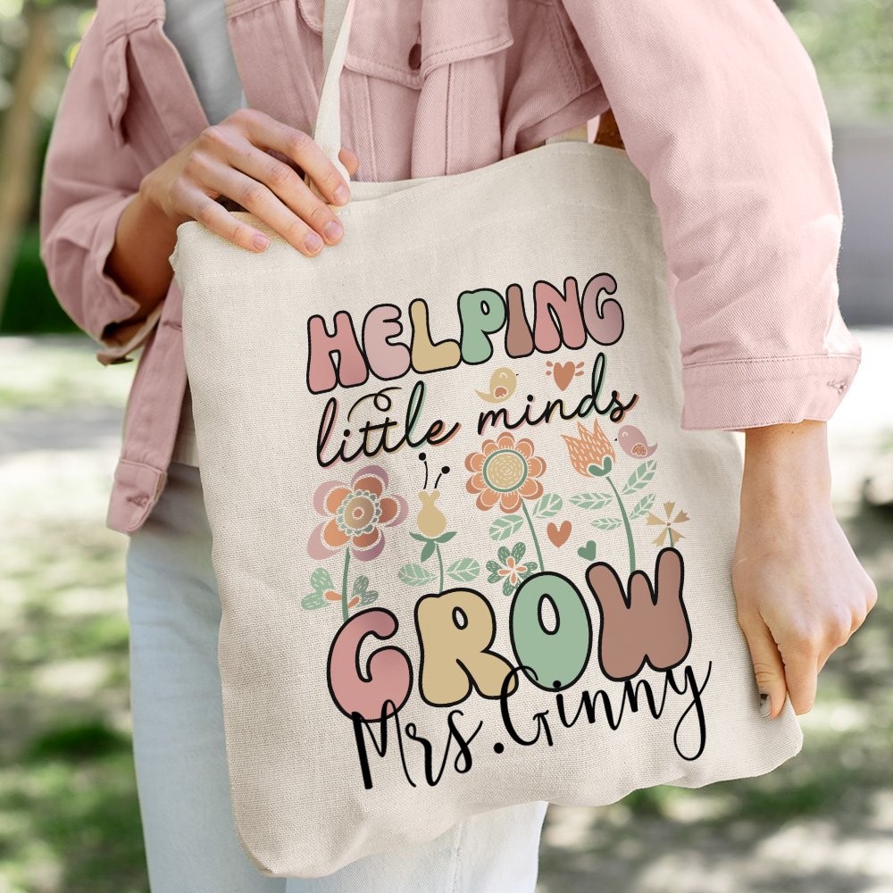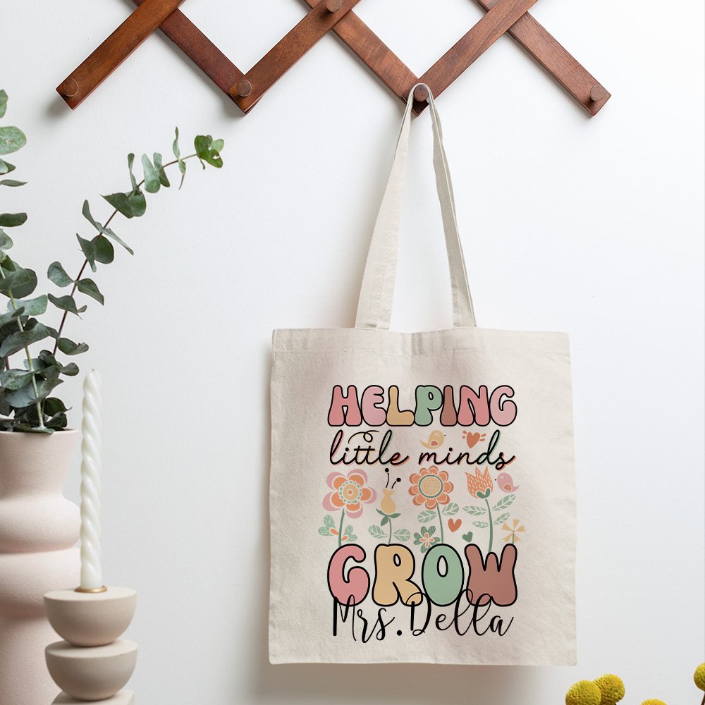The tote bag features the heartfelt message "helping little minds grow," the beautiful flower design celebrates the teachers' greatness, symbolizing how children thrive like flowers under the care of dedicated teachers.