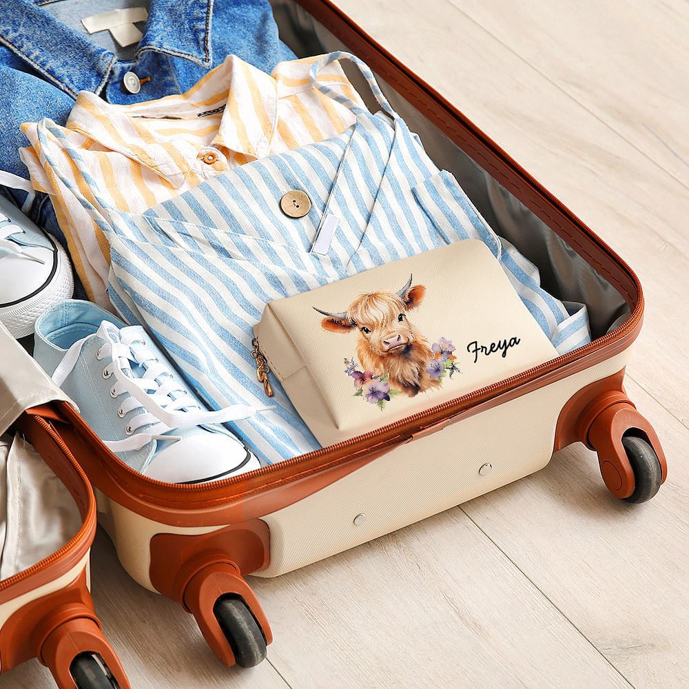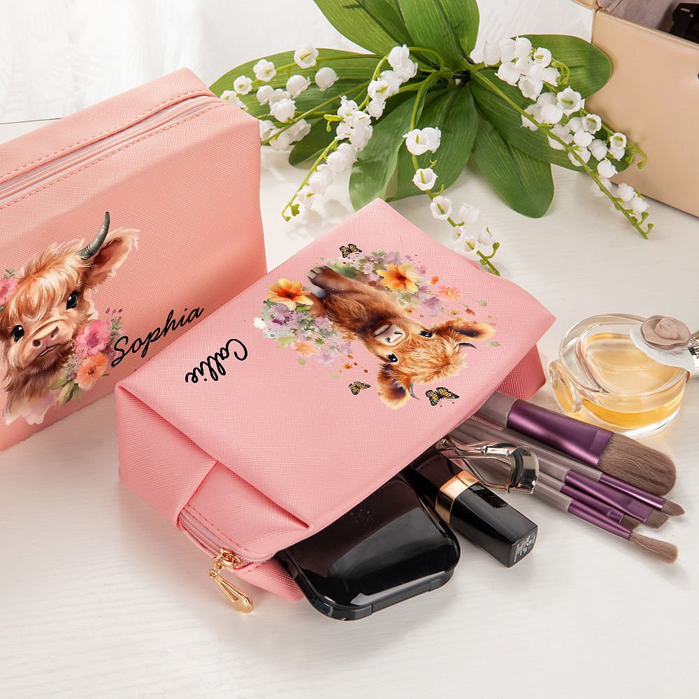 The colour and name of the product can be customized according to personal needs, allowing each makeup bag to reflect personality and taste. The front of the cosmetic bag is decorated with a cute cartoon Highland cow pattern, offering 15 different styles, each lifelike. The design of the Highland Cow image is adorable, artistic, and childlike, and is deeply loved by women and young people. A name can be customized below the pattern to give the product a unique and Personalized feature.